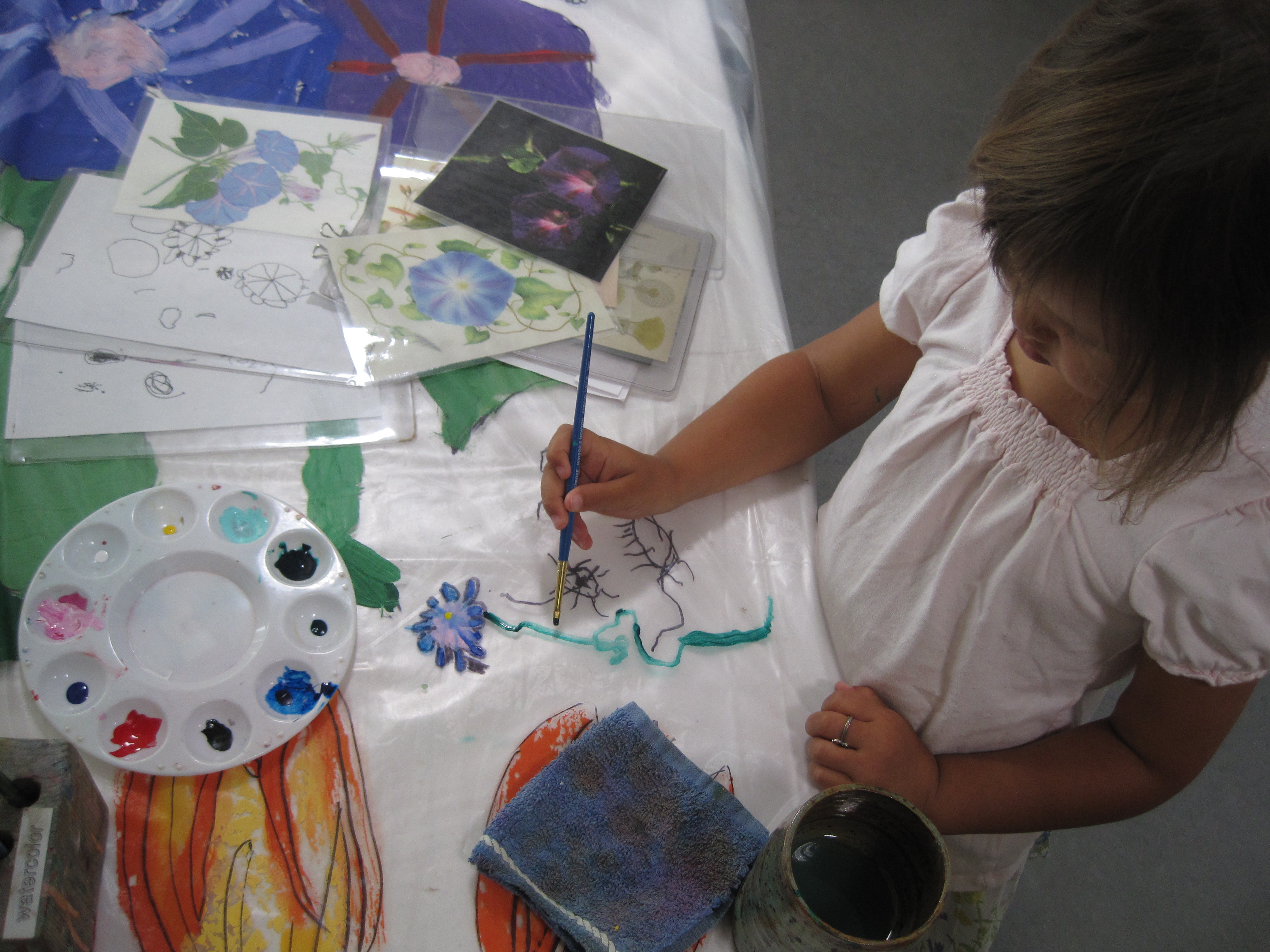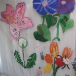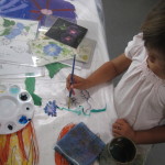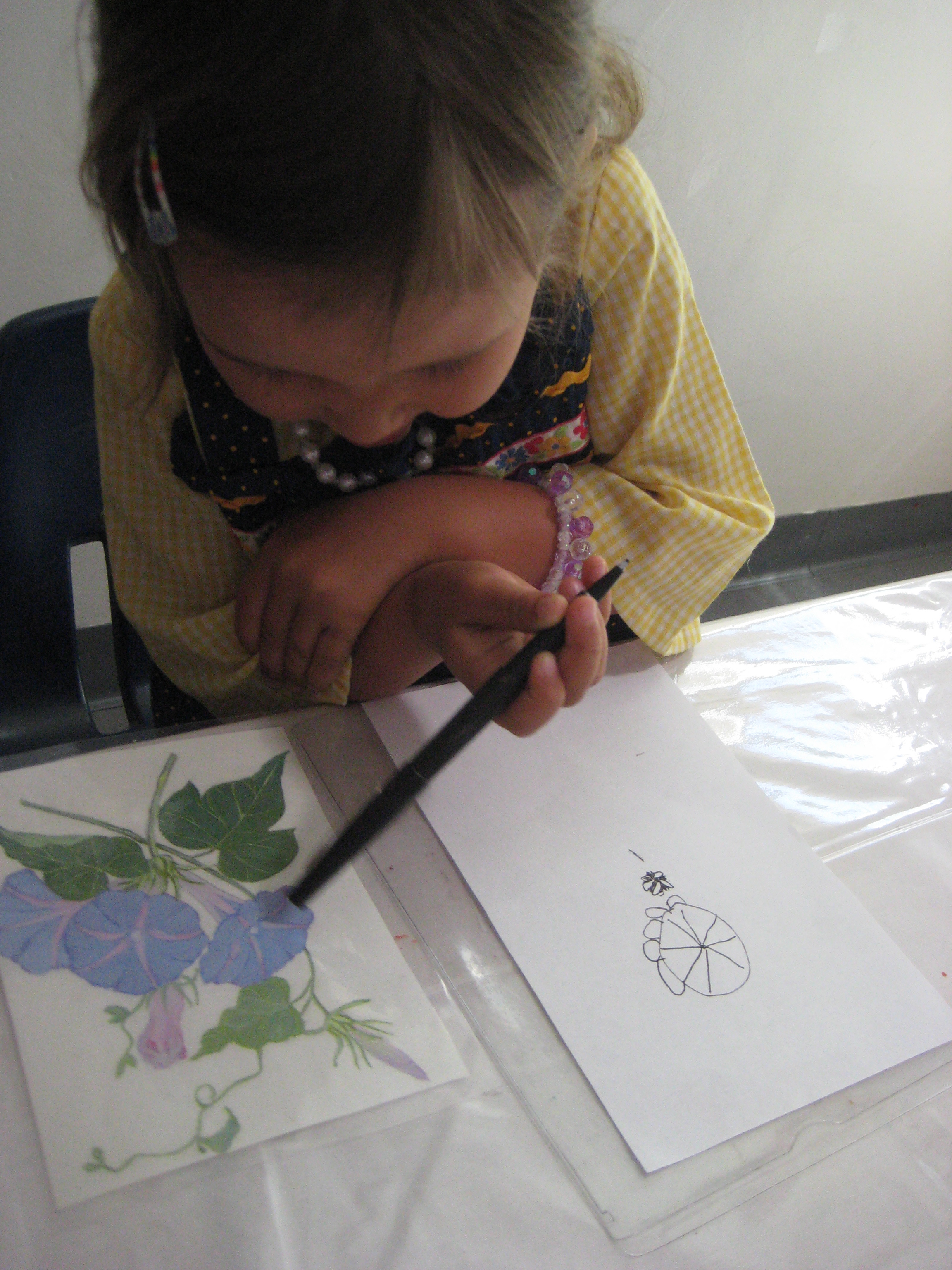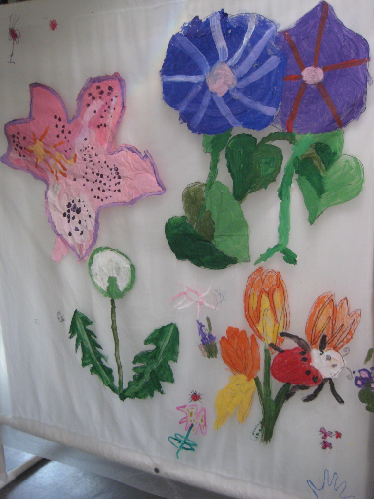 For inspiration the children looked over books, images, and other models of flowers and insects. After deciding what they wanted to represent, they worked on practice drawings until they were ready to use one for the Flower Curtain. Next, they traced their drawings onto the curtain, and then the color palette was considered . The final step was to paint their work. This work happened in many layers over a period days.