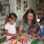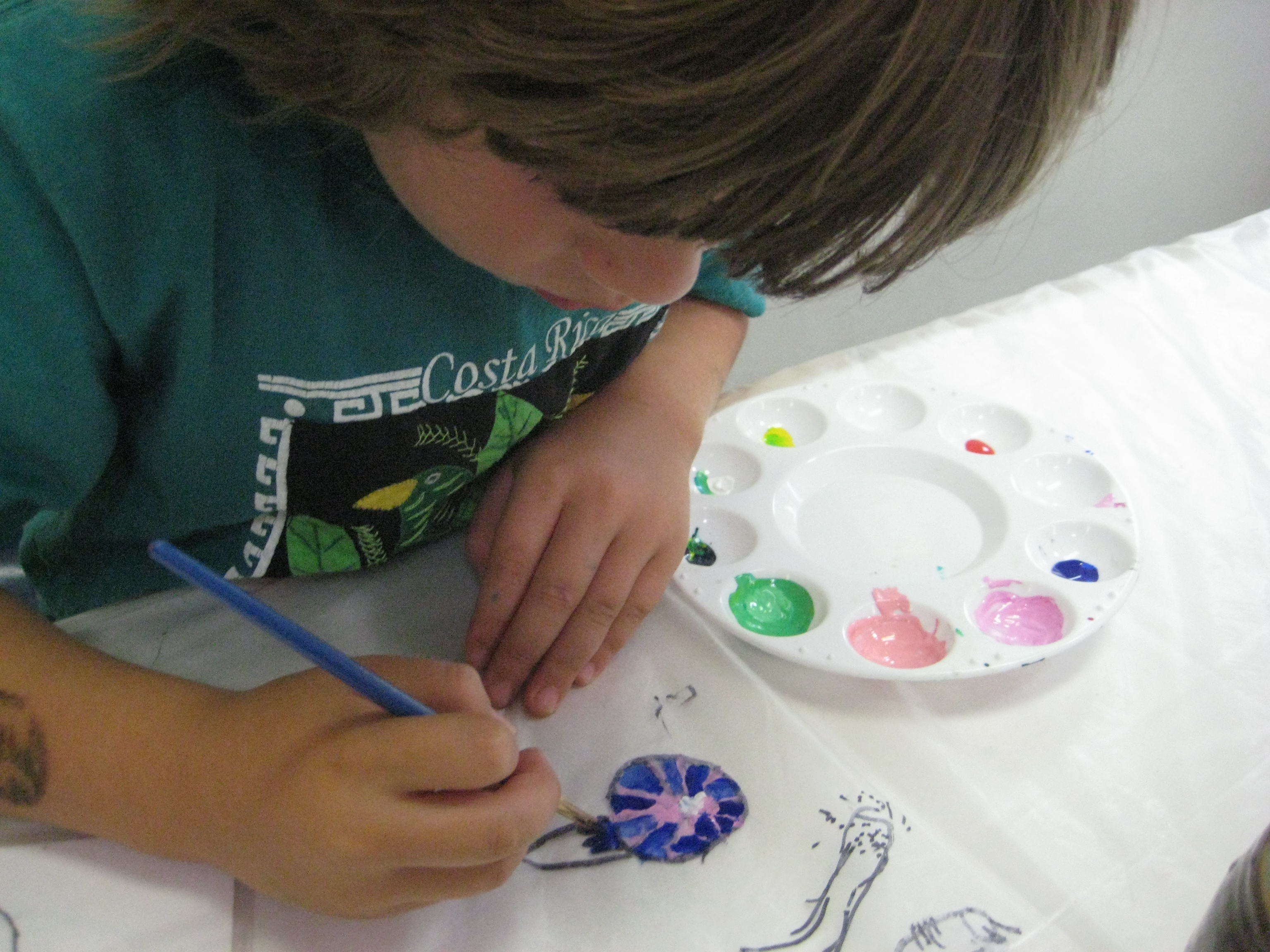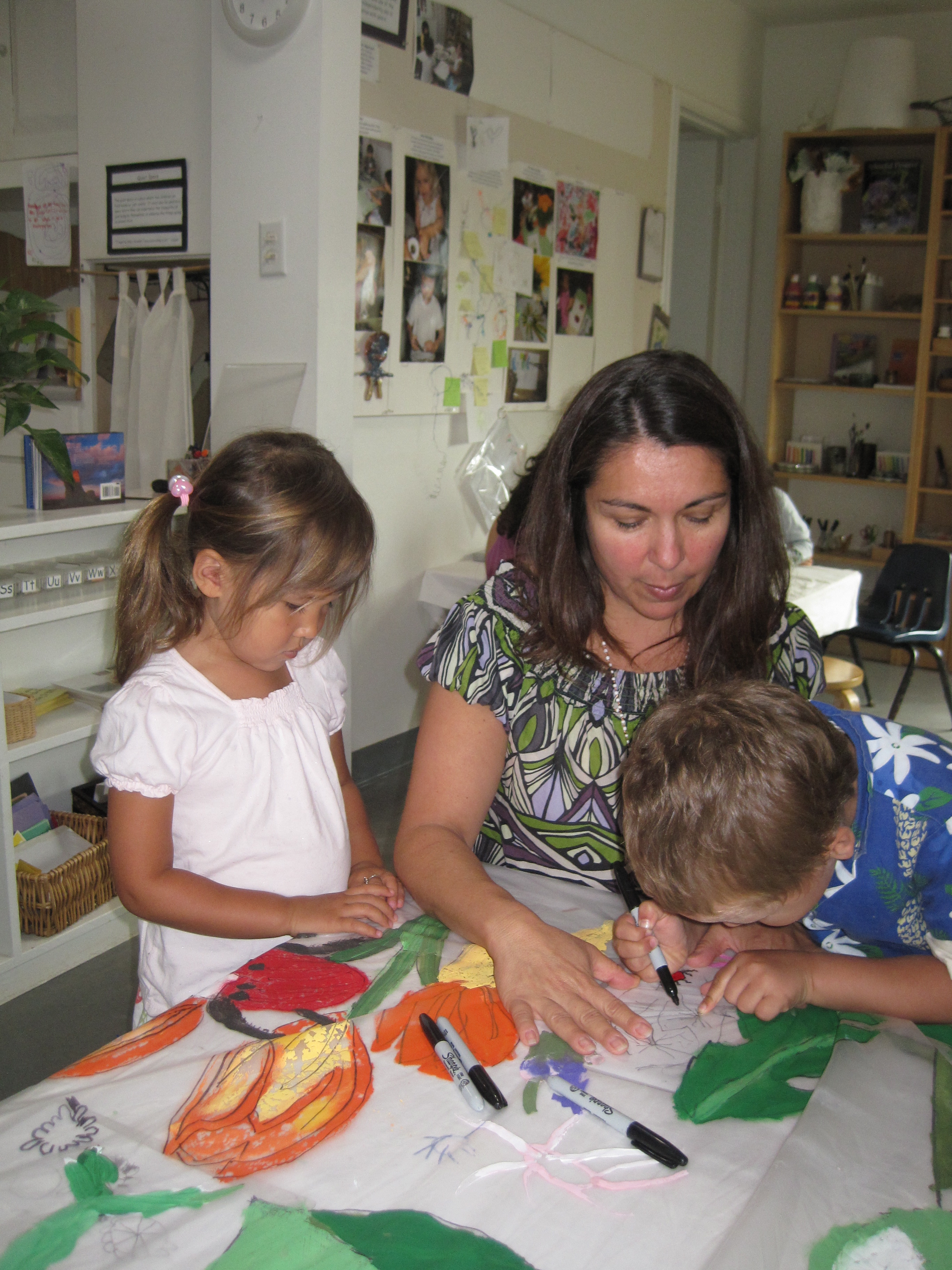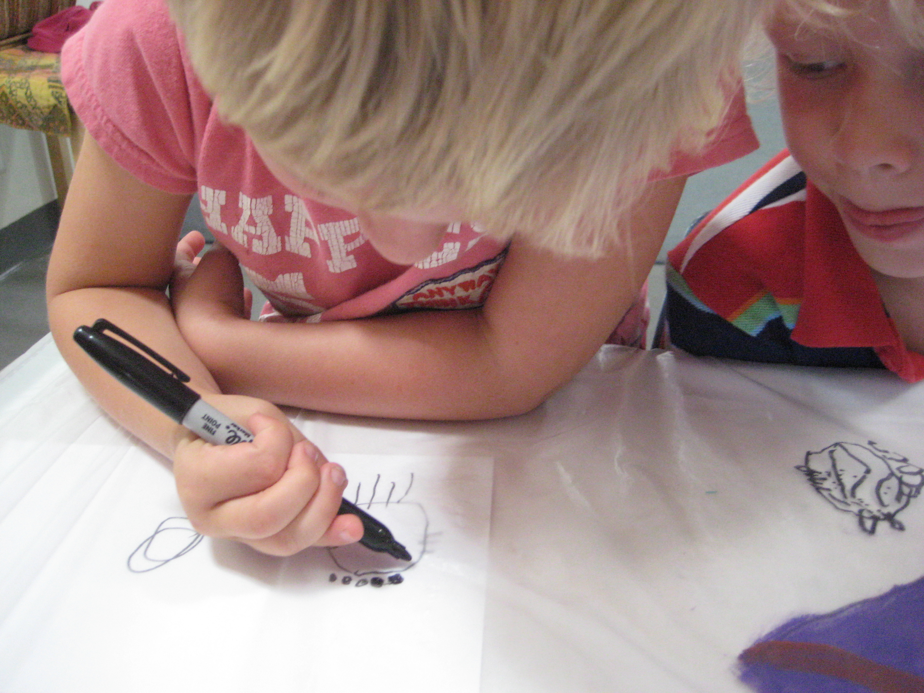 For inspiration the children looked over books, images, and other models of flowers and insects. After deciding what they wanted to represent, they worked on practice drawings until they were ready to use one for the Flower Curtain. Next, they traced their drawings onto the curtain, and then the color palette was considered . The final step was to paint their work. This work happened in many layers over a period days.