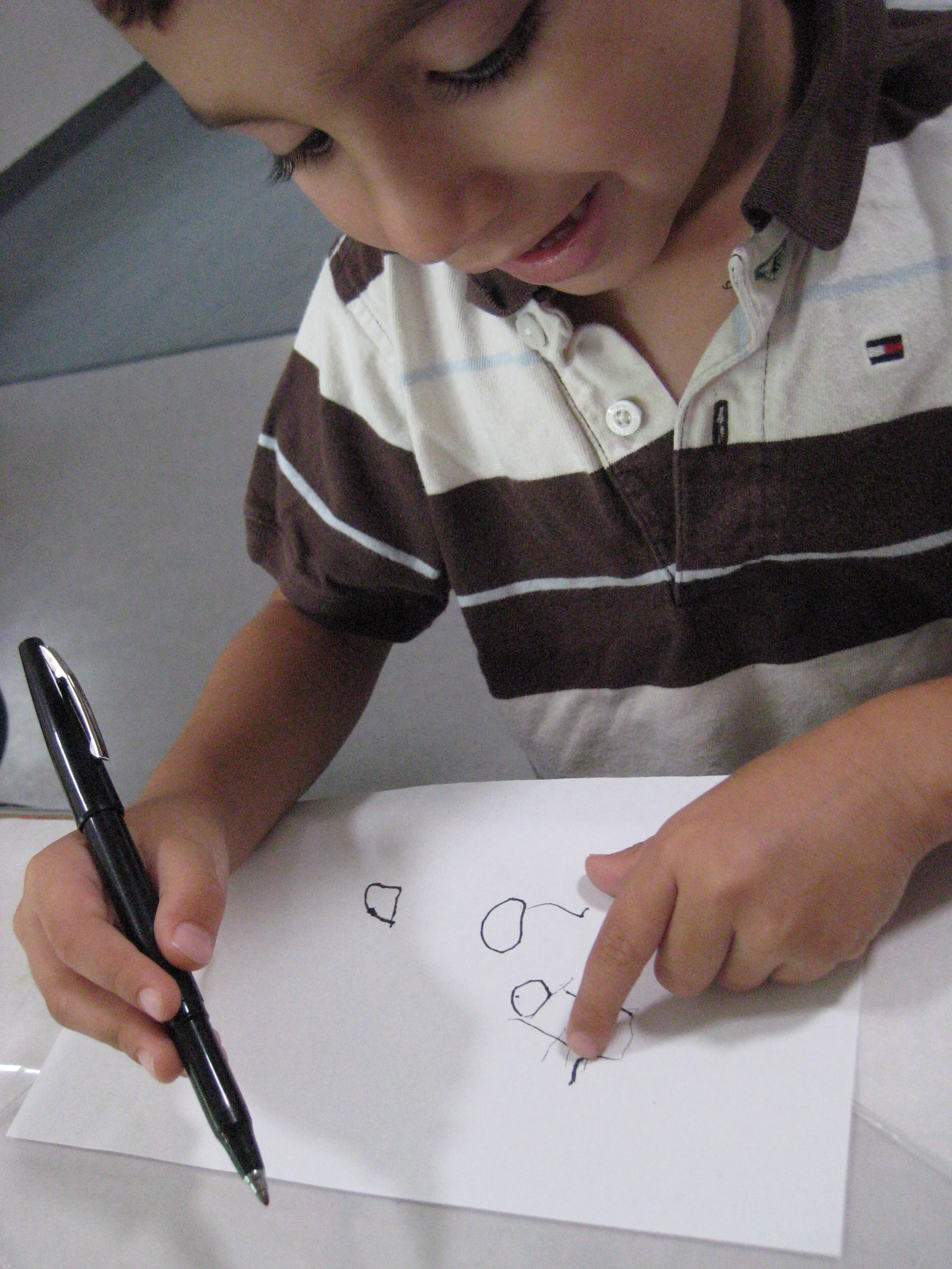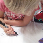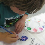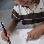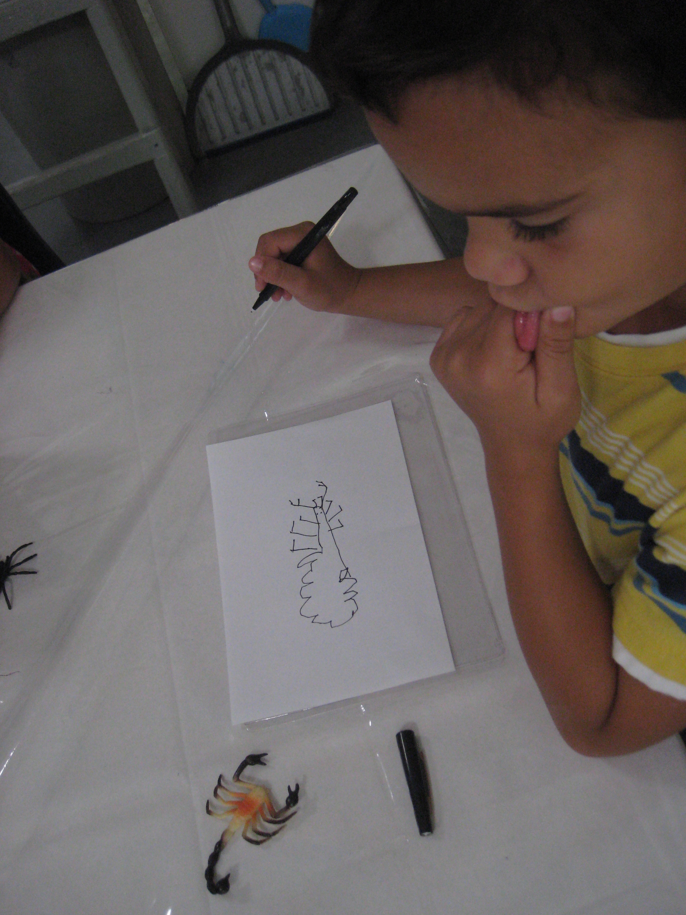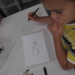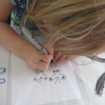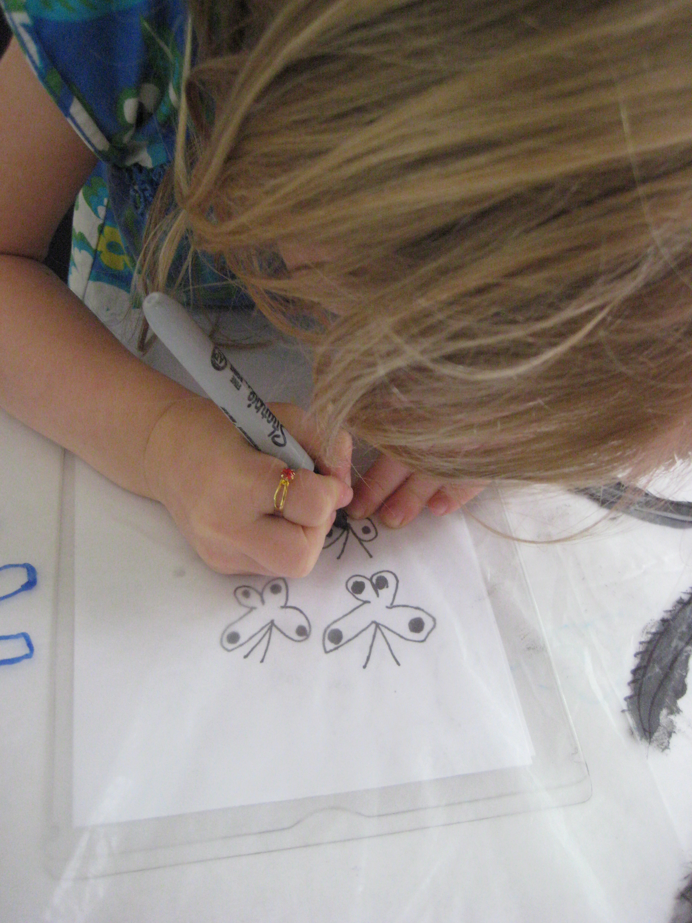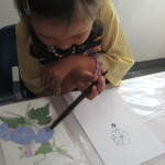 Reflecting on the children’s long term investigation of flower’s, the teachers have wondered what effect this has had on the children’s observational tools, fine motor skills, and their ability to stay on task while exploring and representing flowers. A decision was made to revisit the flower curtain that was created to support the Fancy Flower Day party. While looking closely at the curtain, the children noticed a ladybug on one of the flowers. With excitement they expressed a strong interest in adding their own insects as well as flowers to the shower curtain.