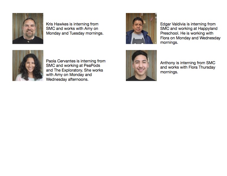 Every semester, teachers Flora and Amy present the qualities of our school and our level of teaching at Santa Monica College Early Childhood Education Classes. Roleen also teaches ECE classes at SMC and speaks of our unique setting and environment. So, when it’s time for students to do their practicum hours, they reach out to us. Policy dictates that they are never alone with children and do not assist them in personal needs. Amy and Flora are certified by the state of California through the California Mentor Program to guide interns during the hours they are here. We accept the interns who have a connection with us and a strong desire to work within our approach. This program is where almost all of our current teachers came from (even me). So please welcome Kris Hawkes, Edgar Valdivia, Anthony Garcia, and welcome back – Paola Cervantes who worked with us for 9 years before opening her own school.