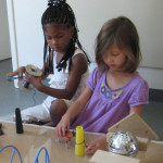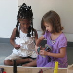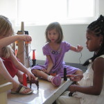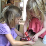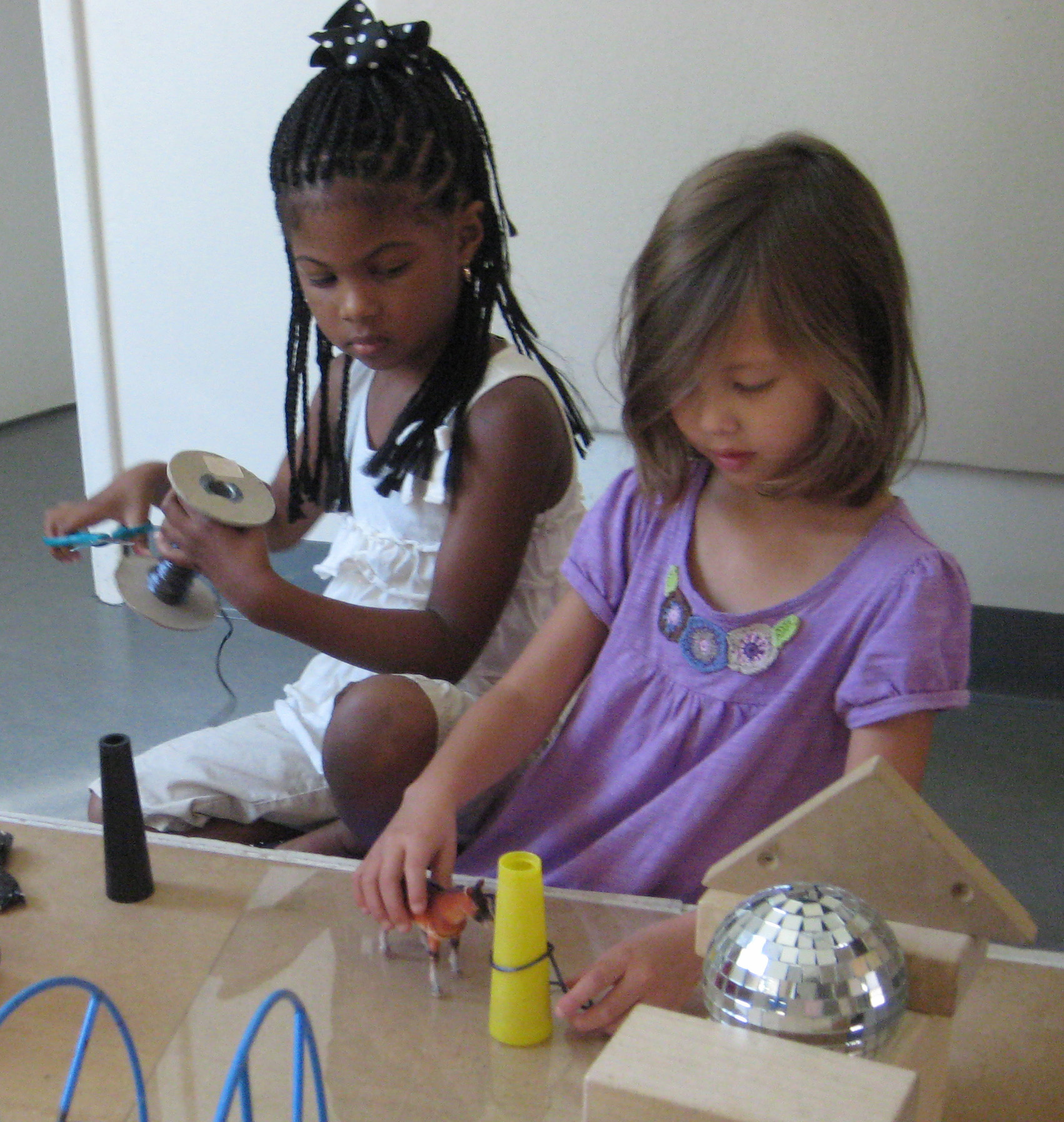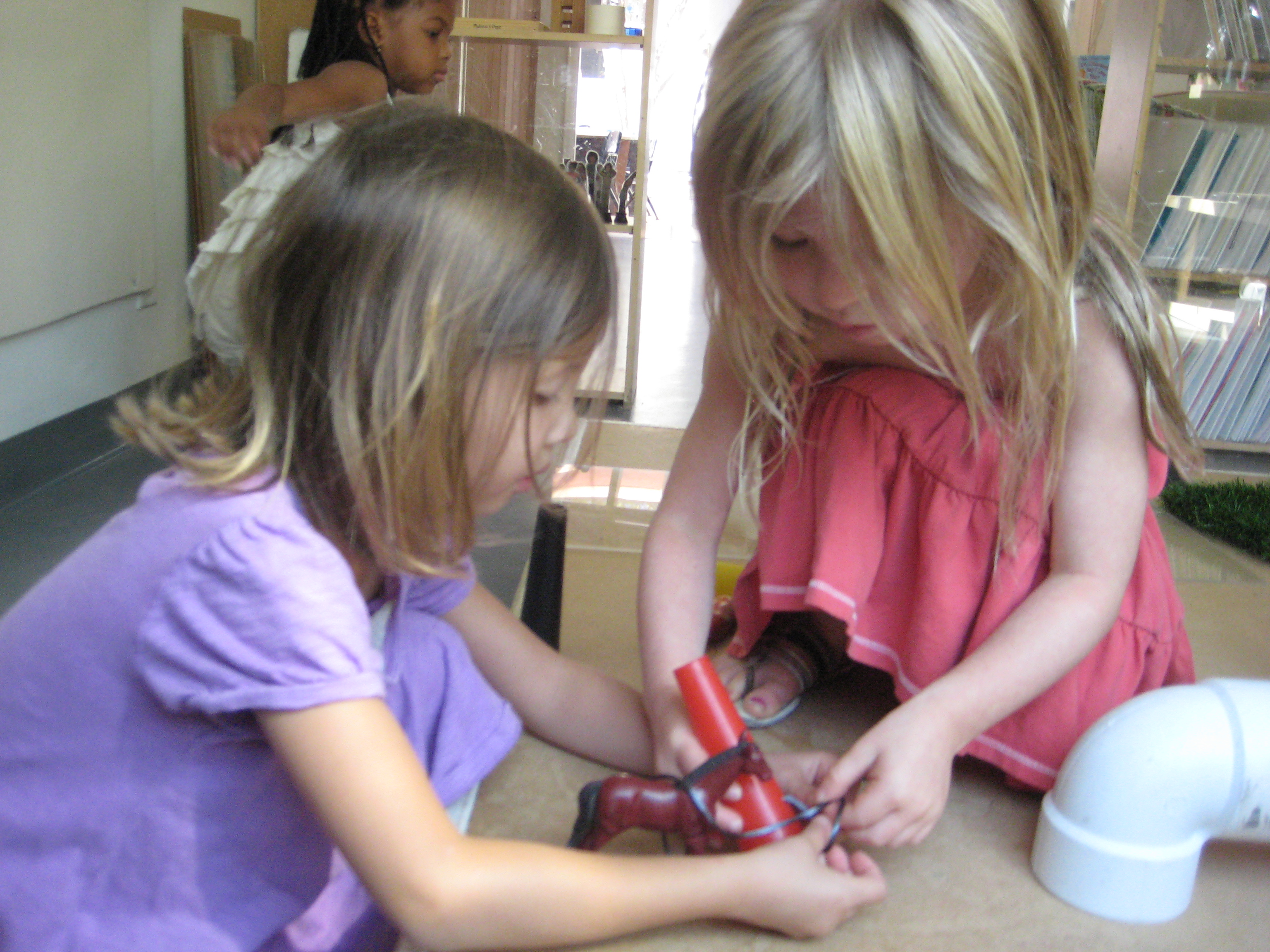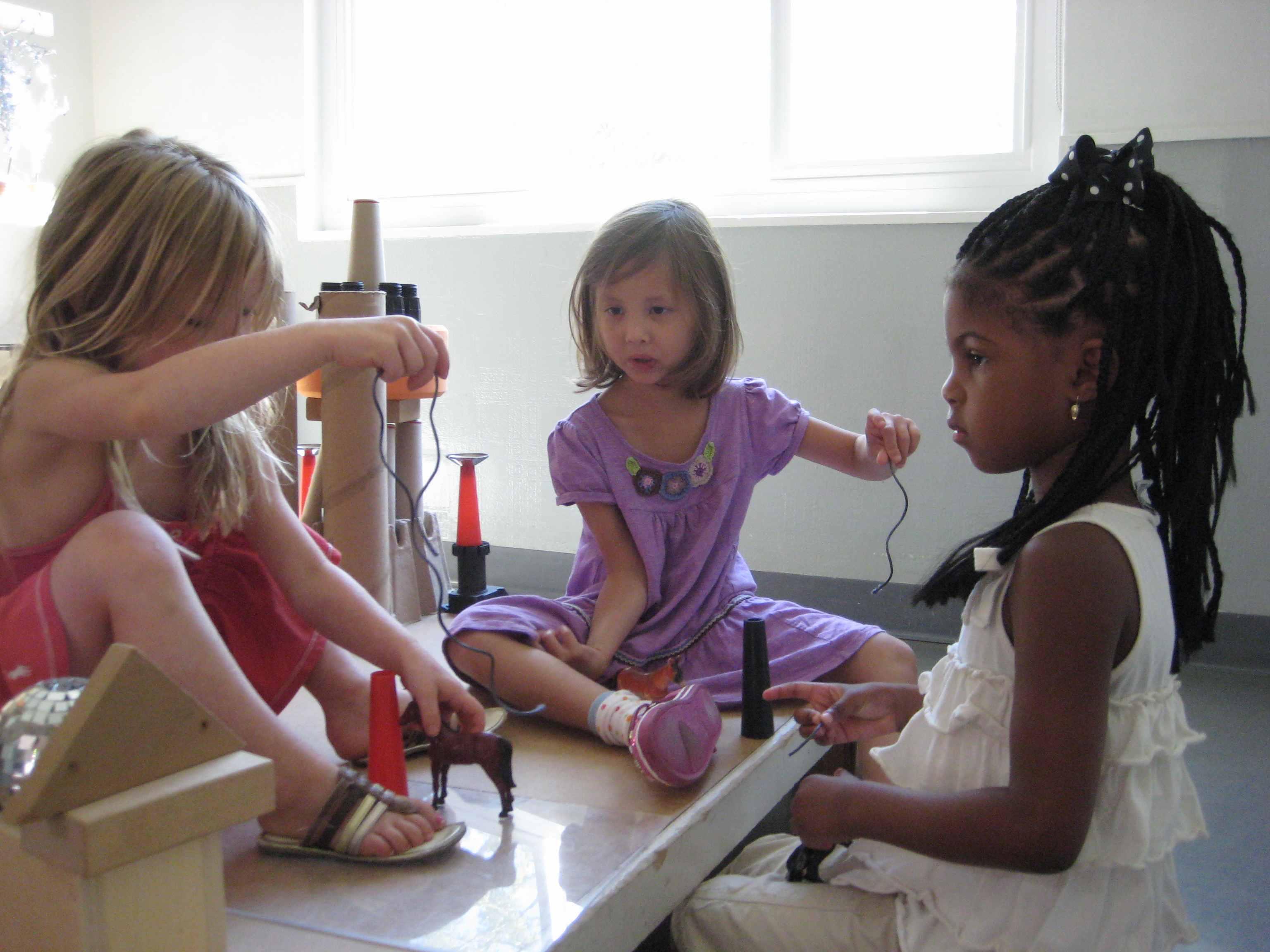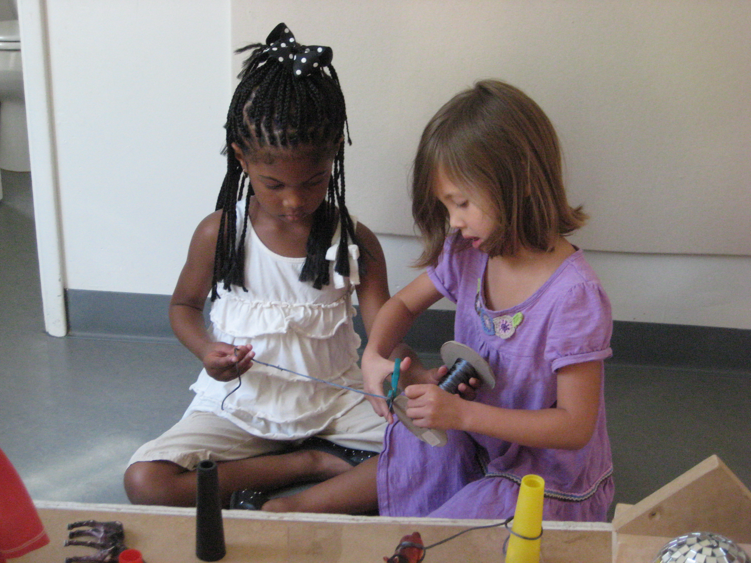 The girls come running back enthusiastically, “We found this!” They bring back a spool with string. They begin to measure and estimate how much string they need. It takes a few trials before acquiring a size they feel works well.