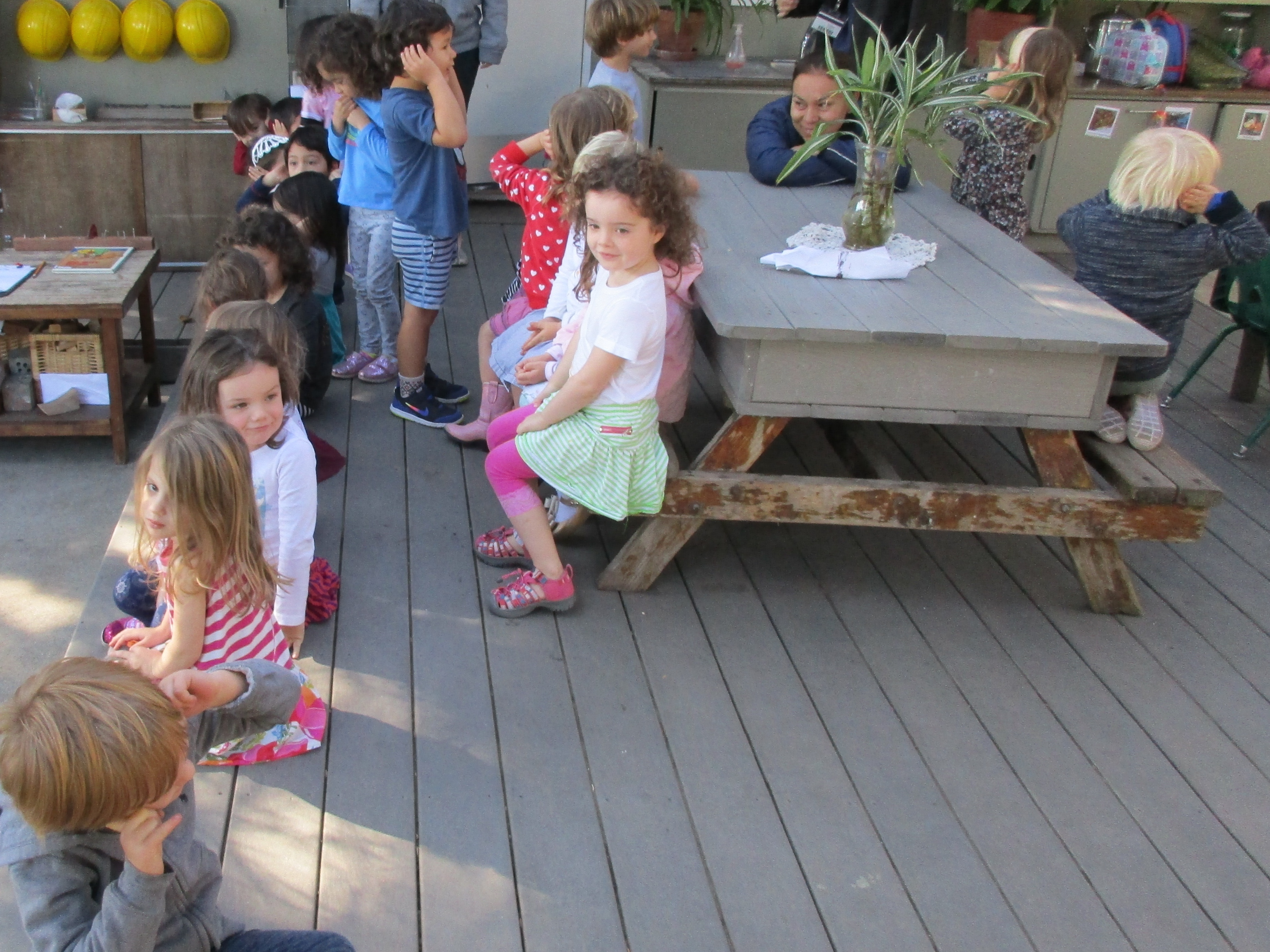 After pull the bell, the children practice stopping their work, looking at the teacher and listening for directions. Today we listened to the bell inside and outside in preparation for a walk out to May Street where we would normally gather in a real situation.