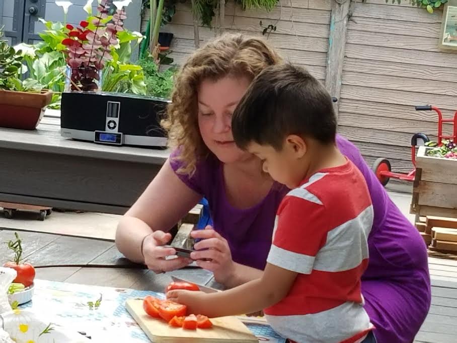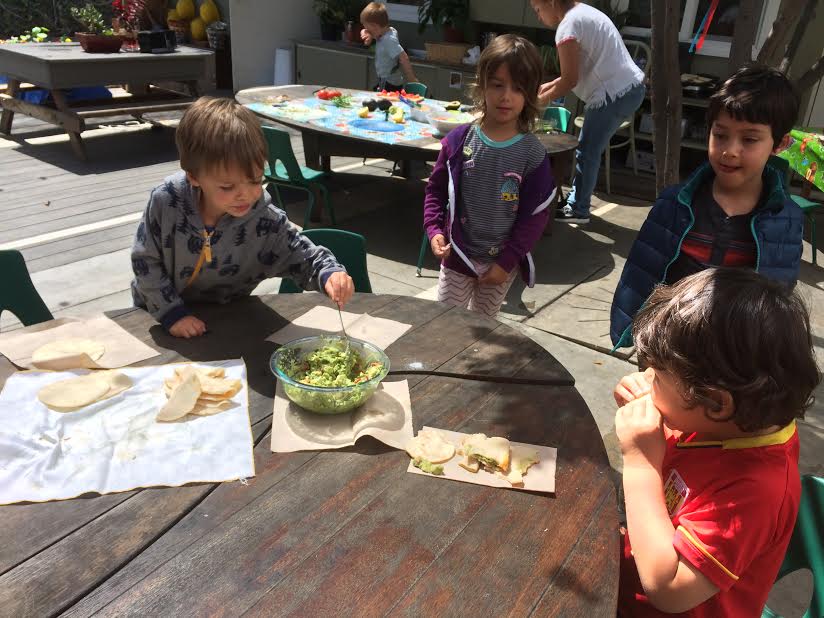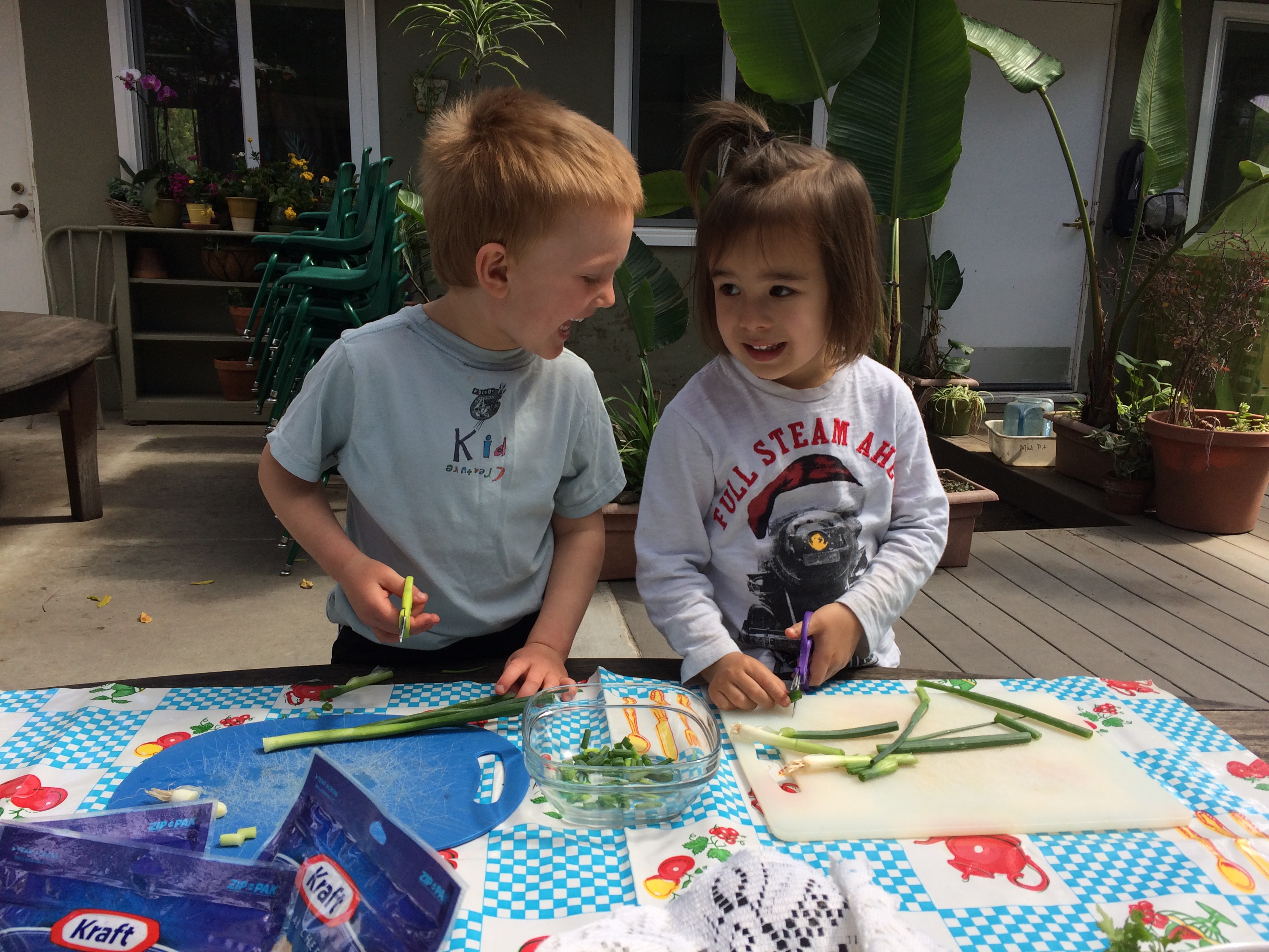 Henry and Remy went to work cutting green onions and pulling cilantro leaves for the guacamole.