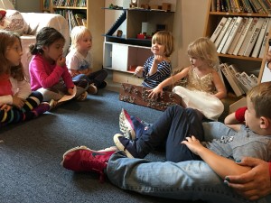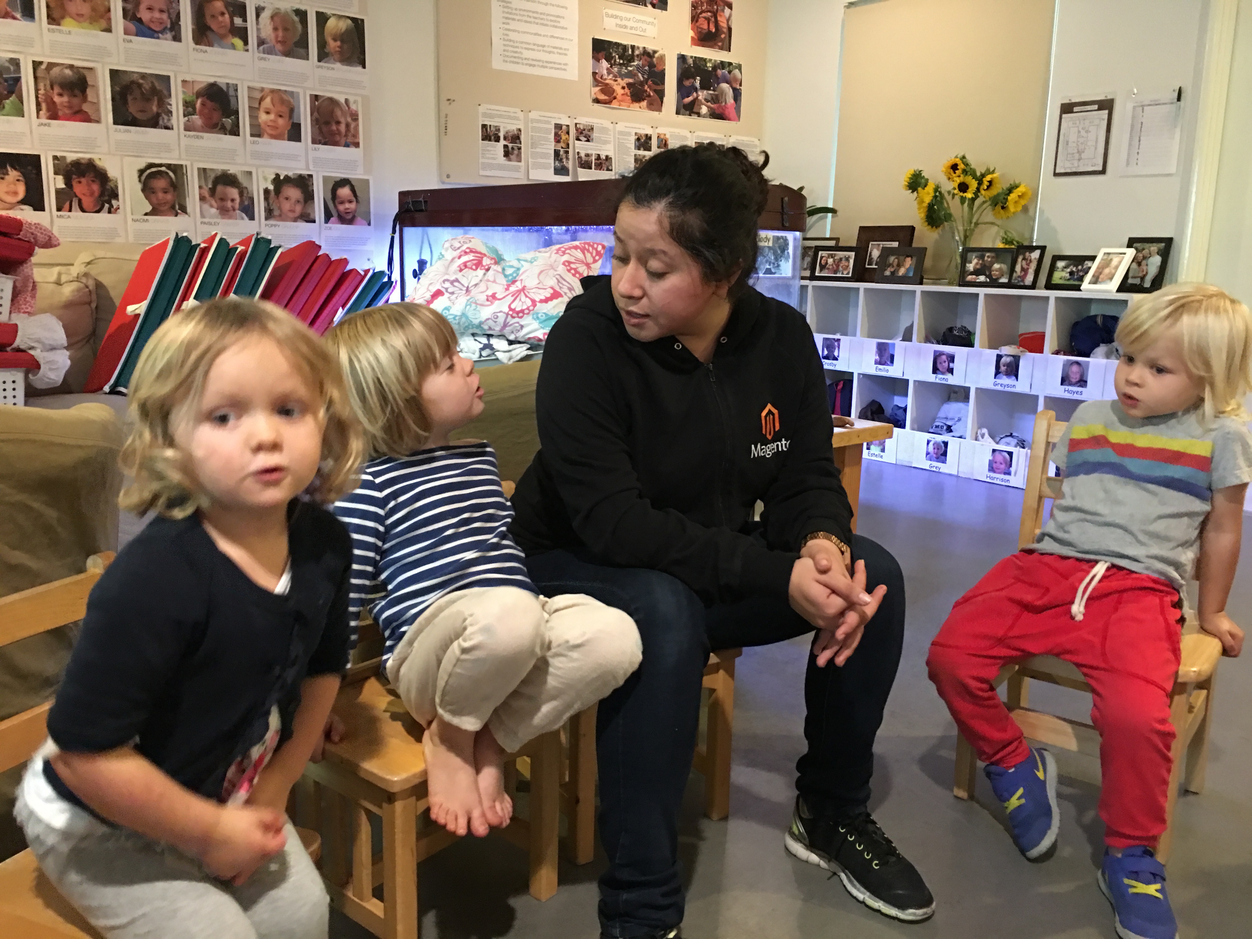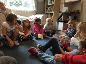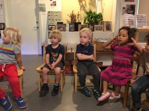 The children had worked for weeks on making a welcome sign in the Woodworking space in the Front Yard. Teacher Adriana facilitated the hammers, goggles, screws, and wire tools used in this mixed age space. When the sign was complete, the children met to discuss where it should live. She began in the West Wing reflection meeting.