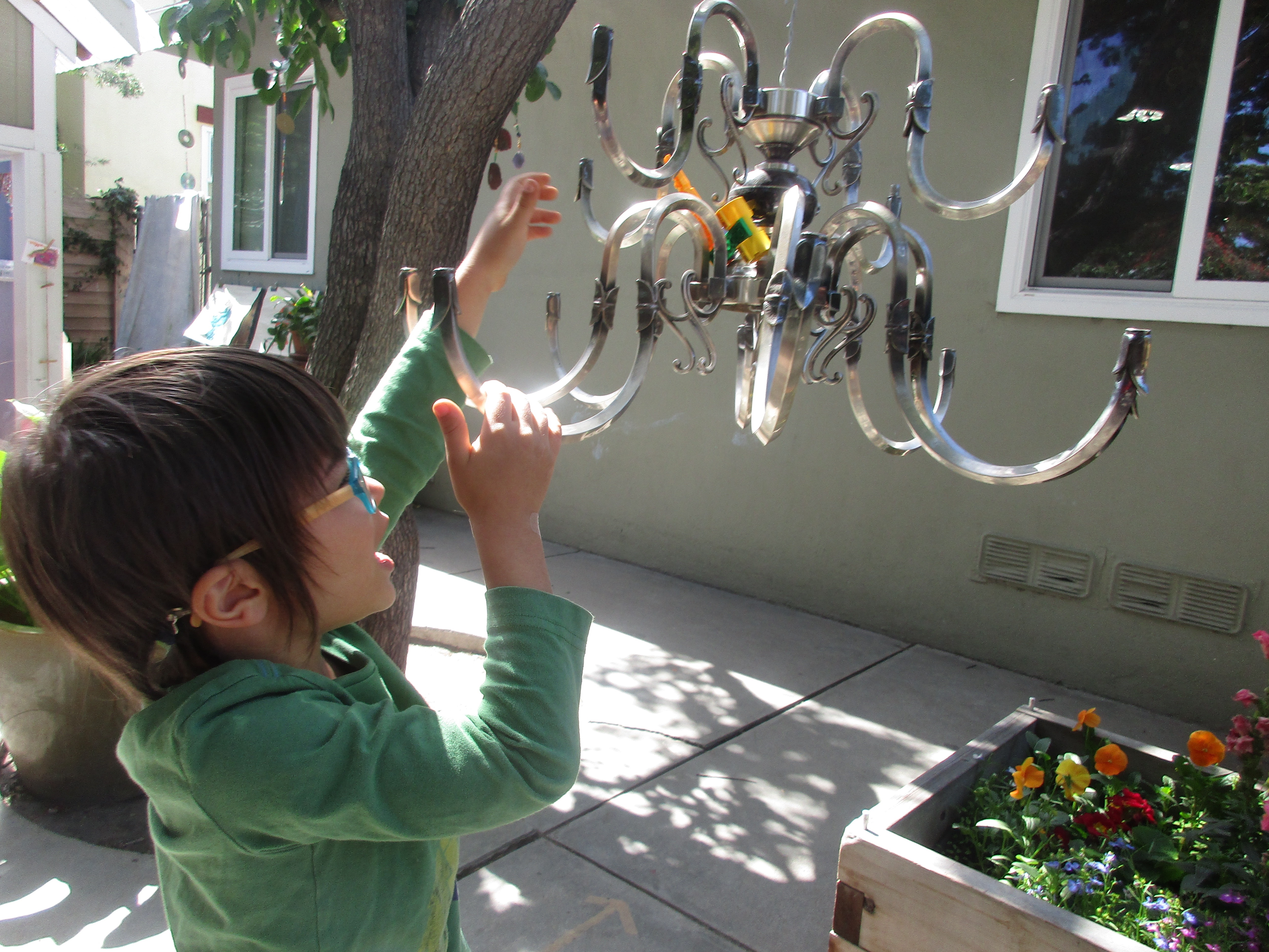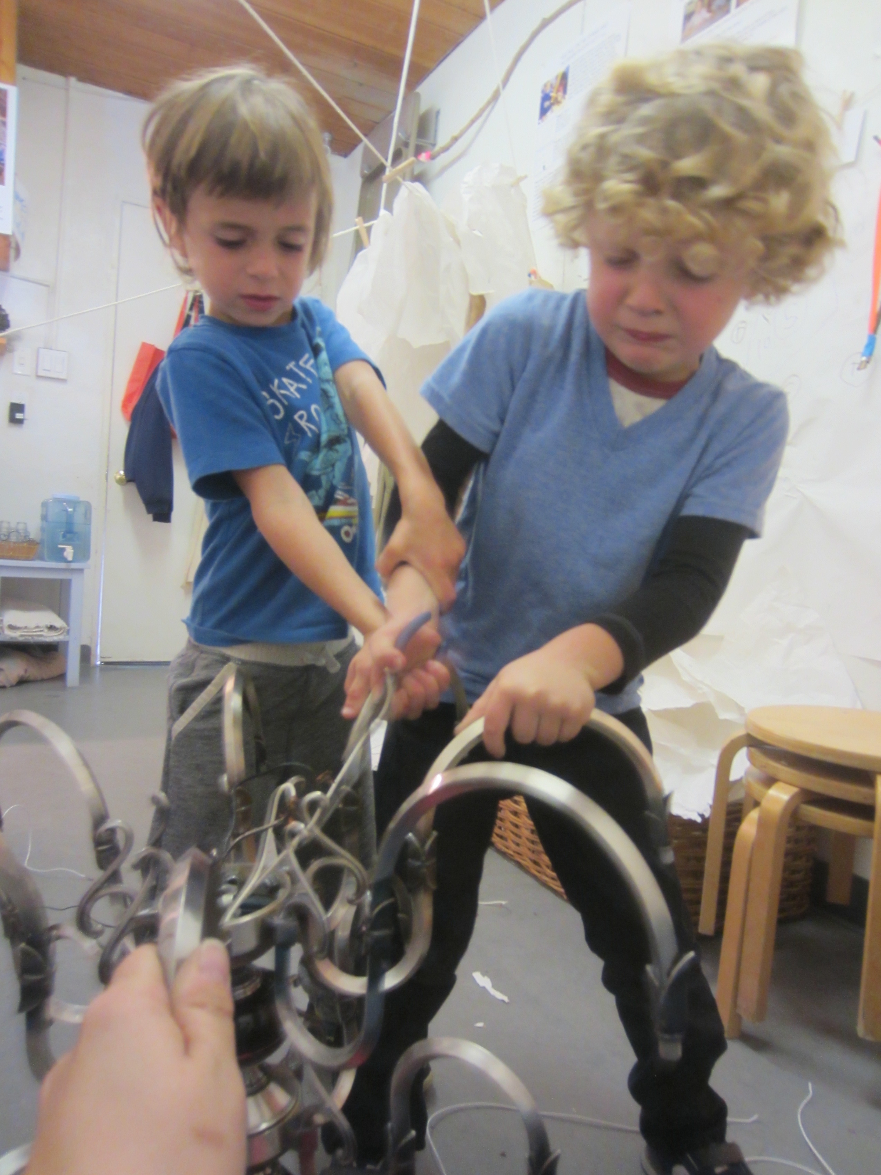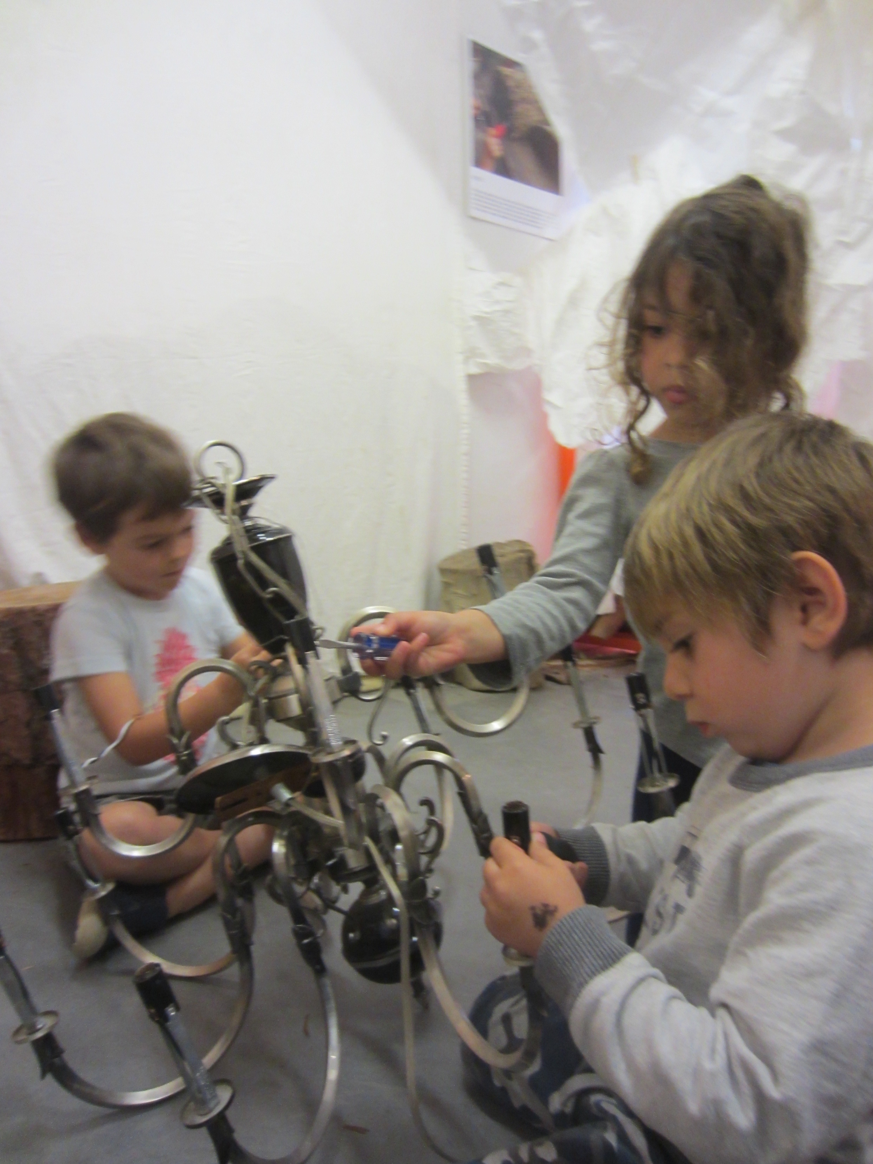 The children pulled out the bulb sockets and wires. They removed the bobeches and gained an intimate knowledge of the chandelier’s main structure while musing about possibilities.