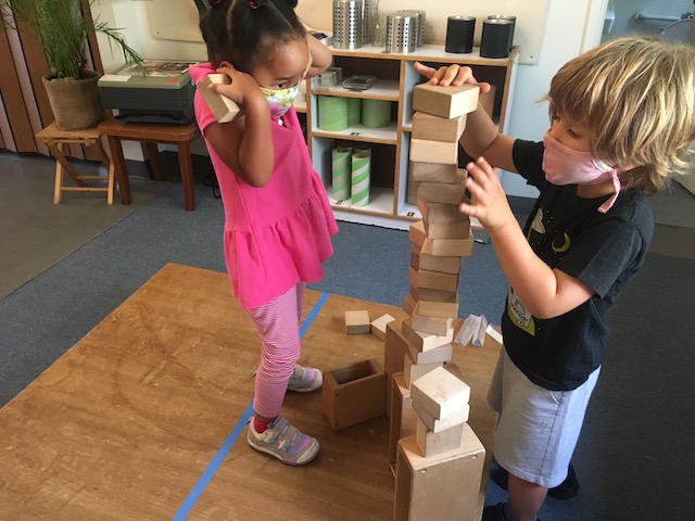 Luka and Ami begin to stack unit blocks to form a tower together. Ami begins to show concern as the tower begins to tip. She attempts to add a block and retrieves it.