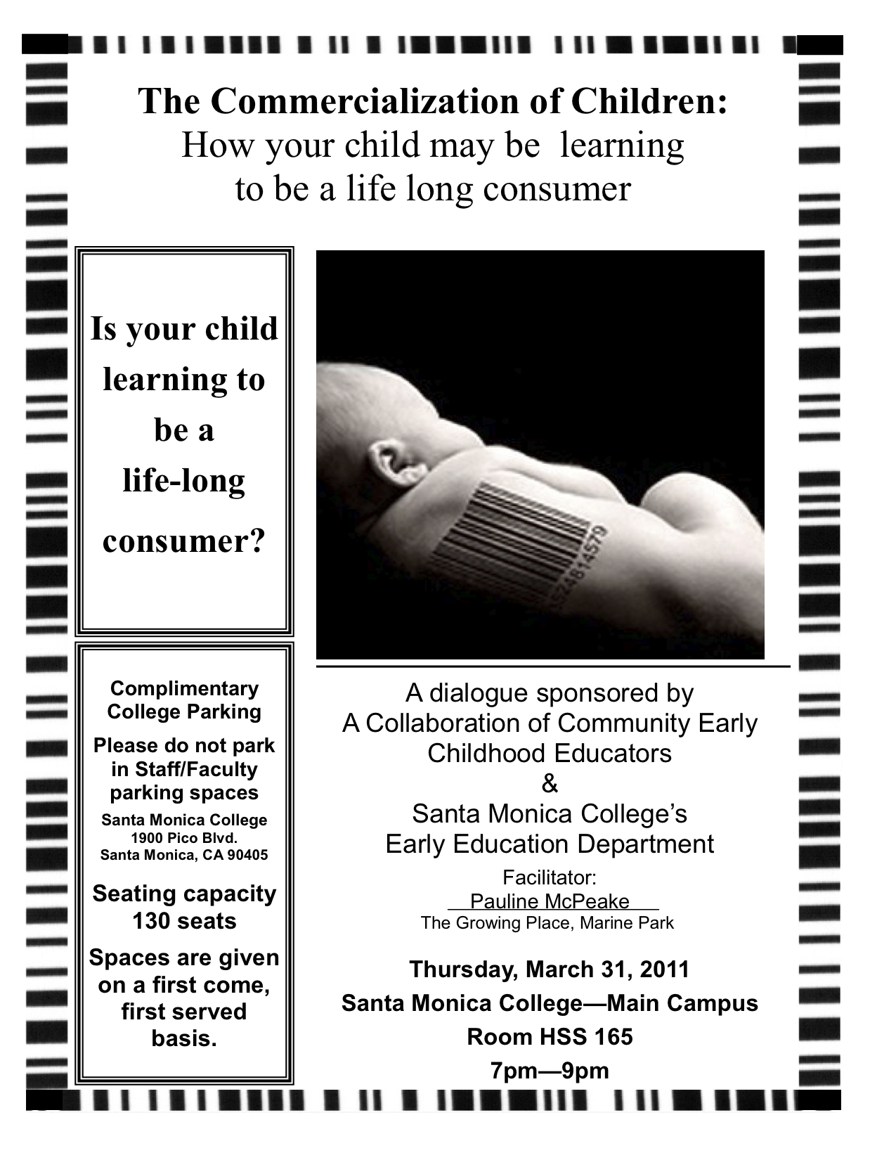 The Commercialization of Children 3/31 7pm-9pm Santa Monica College School Events nswparents / March 8, 2000 / 0 Comments