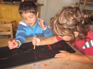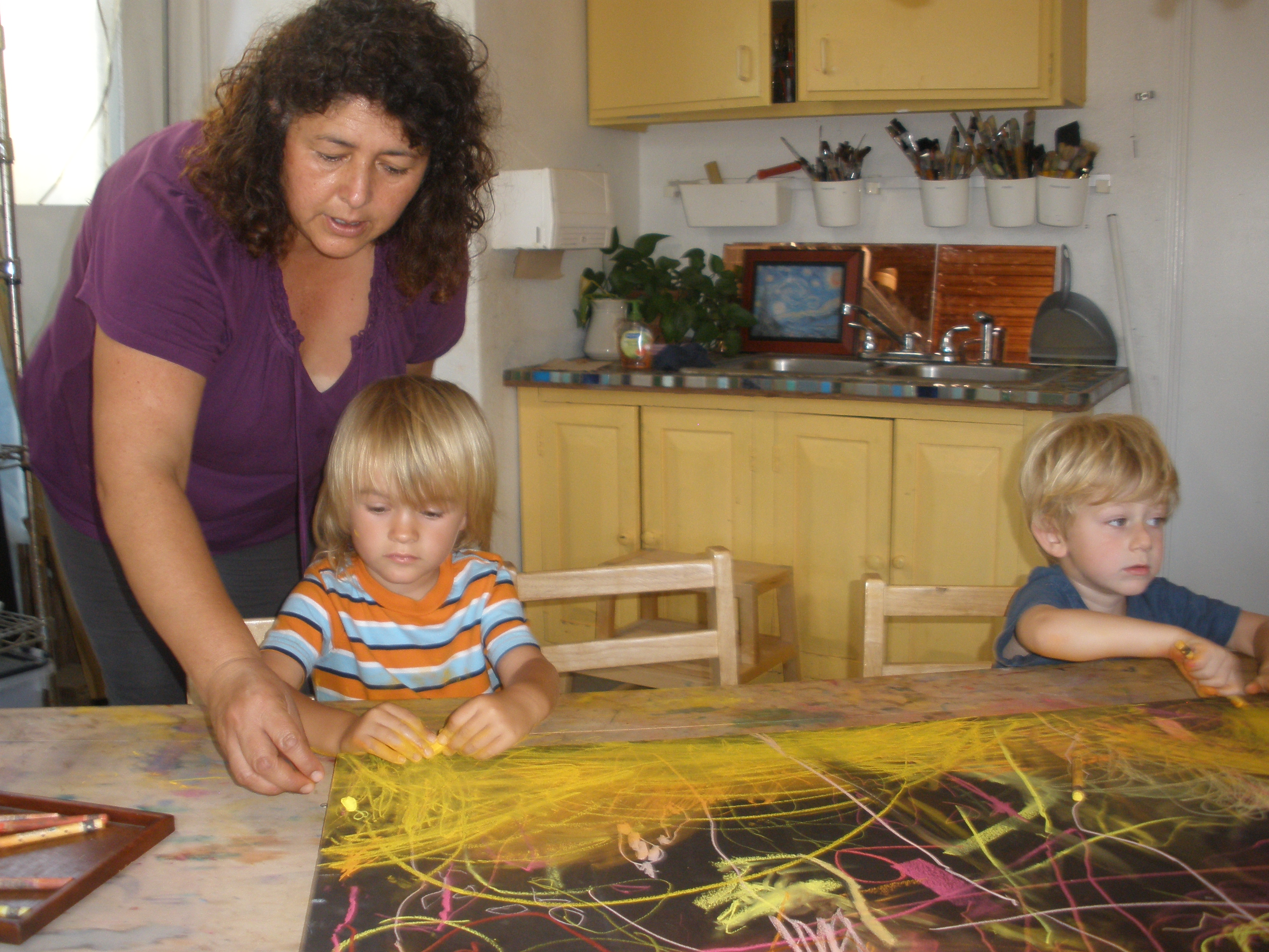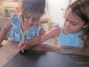 Offering oil pastels and black foam core to highlight the warm colors of their flowers, the children readily partner up and negotiate the space together.