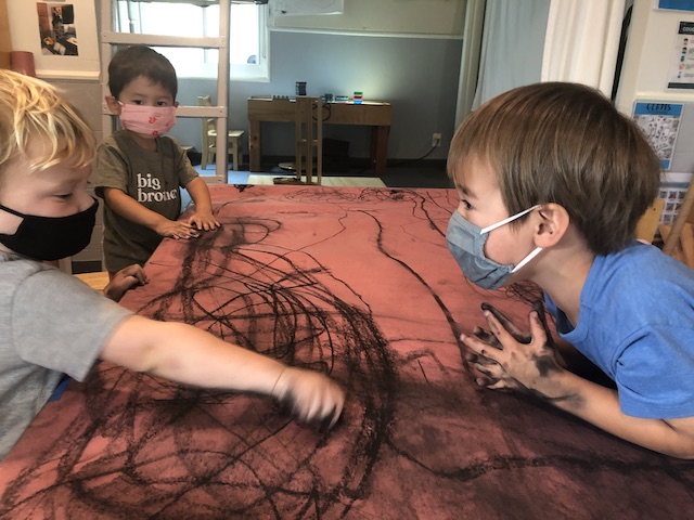The Dandelion teachers had noticed that children were enjoying the sensory feedback from the tempera paints, so we decided to introduce another “messy” material in the classroom: charcoal. Dana invited small groups to the Mini Studio table, where she had set up one large sheet of paper and one large piece of charcoal. Then she welcomed the children to explore with a playful invitation: “Pass the line to a partner.”