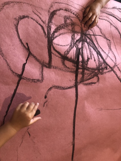 The Dandelion teachers had noticed that children were enjoying the sensory feedback from the tempera paints, so we decided to introduce another “messy” material in the classroom: charcoal. Dana invited small groups to the Mini Studio table, where she had set up one large sheet of paper and one large piece of charcoal. Then she welcomed the children to explore with a playful invitation: “Pass the line to a partner.”