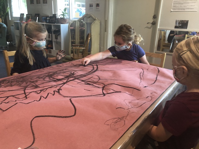 As the charcoal line moved across the shared paper, we saw how in each small group the children were able to move from individual ideas about “my” line to shared ideas about “our” lines. They negotiated not only for the charcoal but also with each other’s ideas. This type of reciprocal exchange lays the groundwork for children to have success not only as strong participants in our classroom but also as active, engaged citizens in our community.