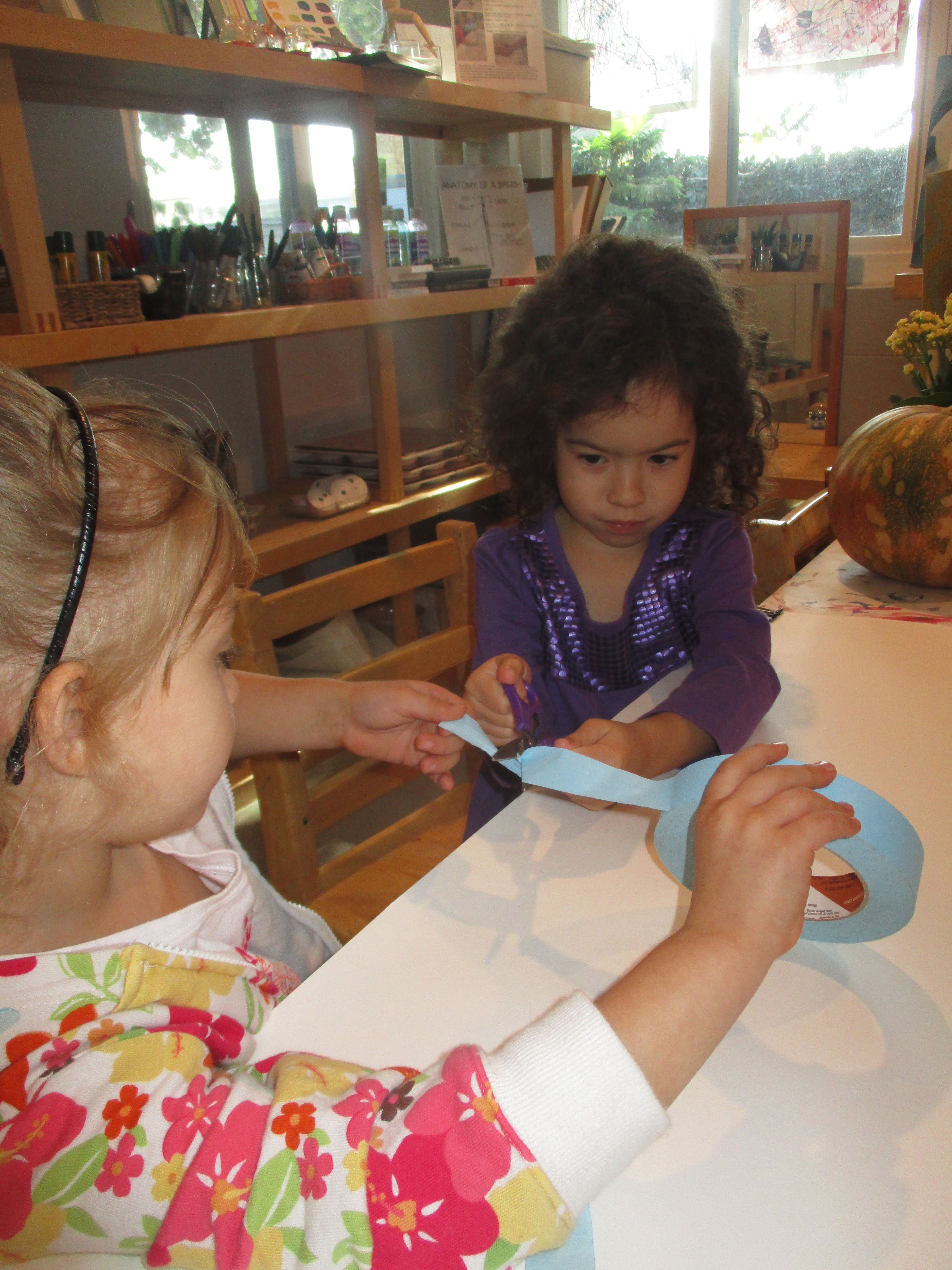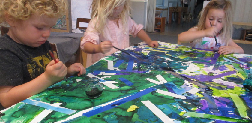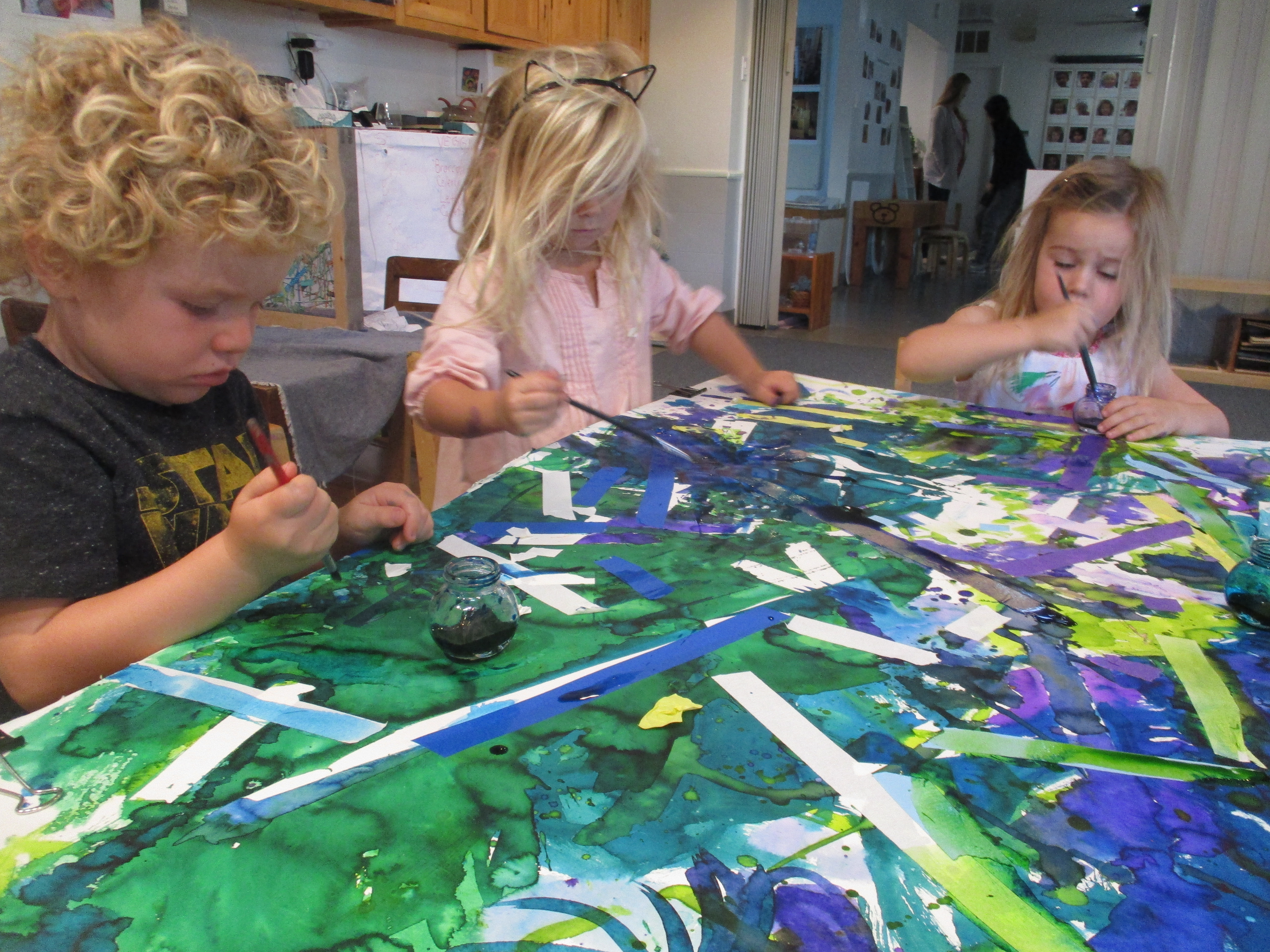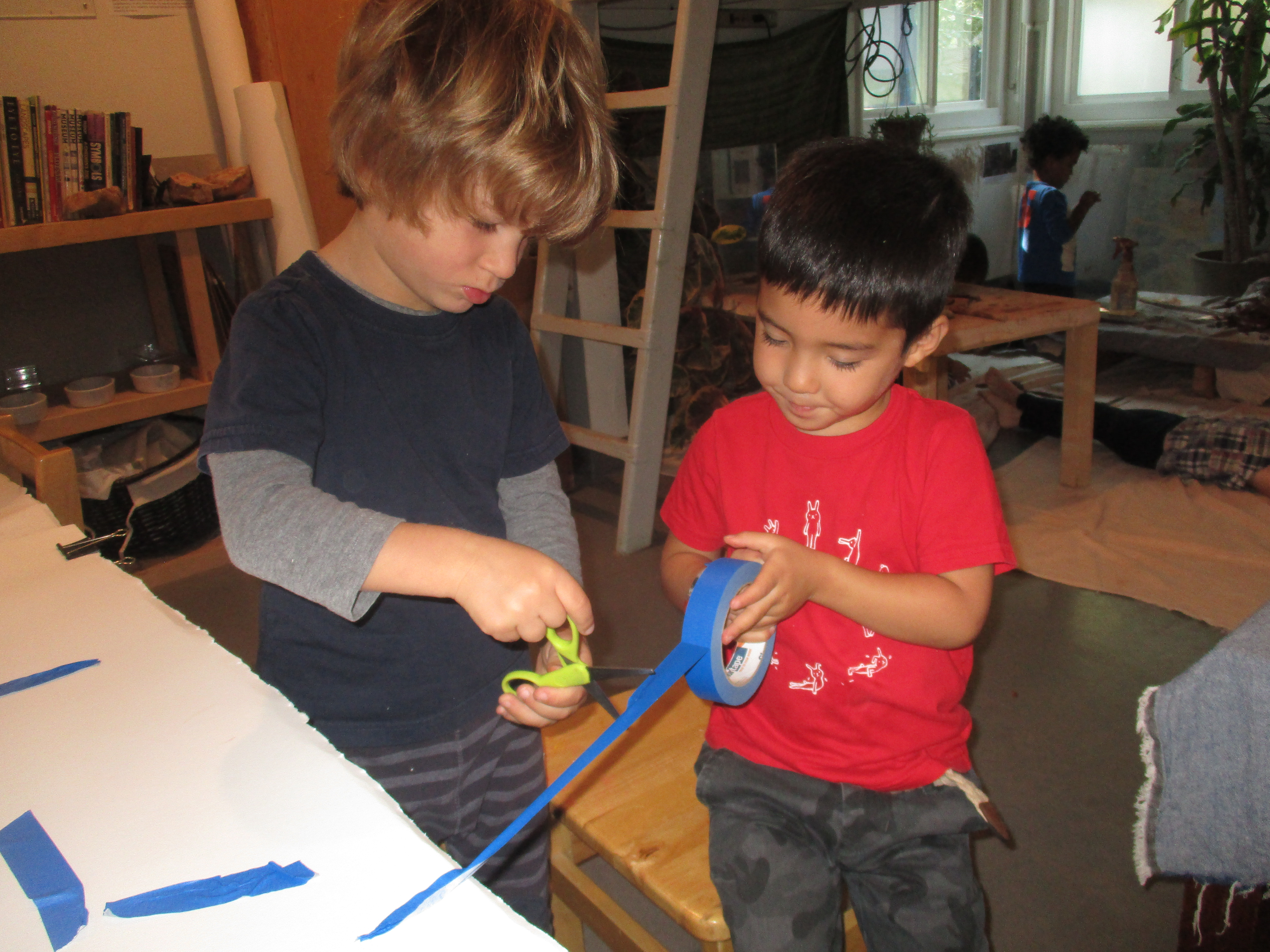 In the West Wing, we focus on introducing a wide variety of tools, techniques, and materials for the children to use. Tape as a resist is one we are experimenting with now.Dashiell: We had to cut the tape.