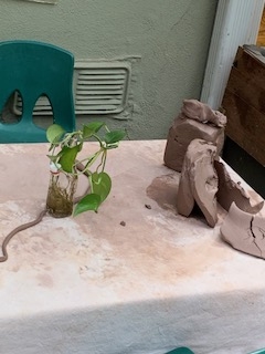 Susan: Last week, Keaton and Mira painted a plant growing in water and its’ roots. Mira said this was the worm family that lived nearby. Today, we can extend the roots with clay representations.