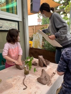 Susan places the paintings nearby for inspiration and the children begin to investigate the clay through this lens