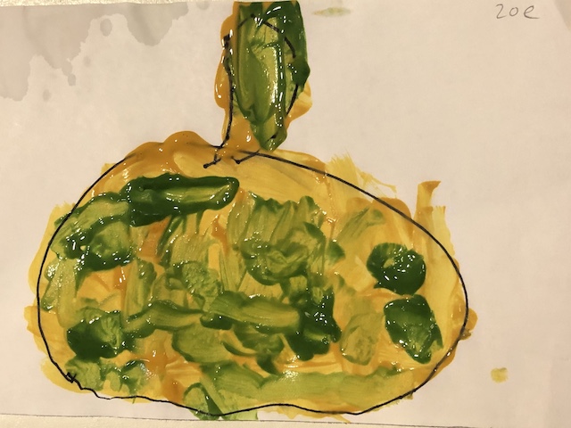 Evyn: I’m noticing this green on the pumpkin. I’m going to add green on my painting.