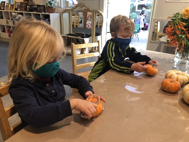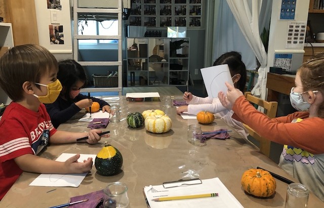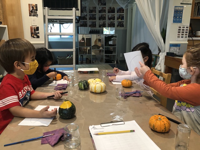 This matching game is a fun way to share the work of the small group with the larger group; importantly, the game also acts to reinforce the idea that observational drawings can convey information and meaning to others who weren’t part of the original experience. Marcel wasn’t at the Mini Studio table that day, and he was still able to understand exactly which pumpkin Evyn was drawing because of her attention to the shapes and colors of the pumpkin. When drawing becomes a language with shared meanings, we find new ways to communicate, build theories, and connect.