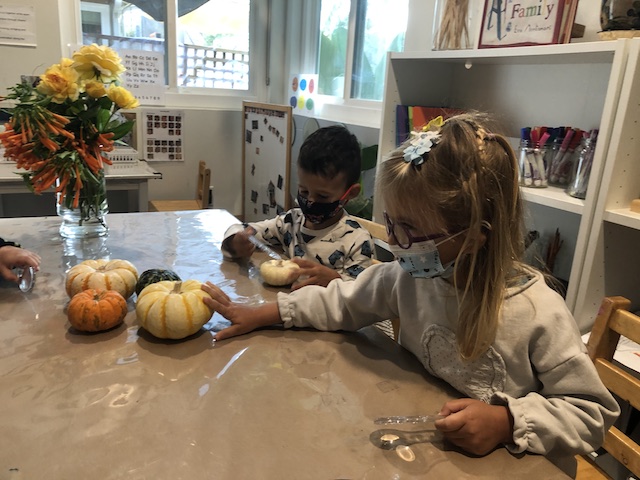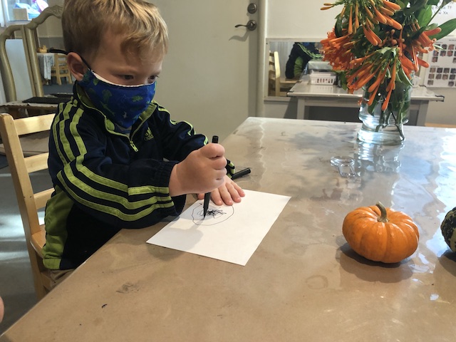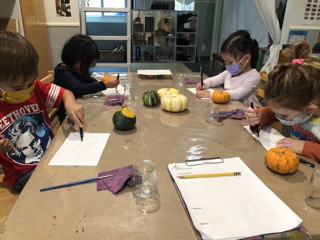 For the past couple of weeks, the children in the West Wing have been introduced to the concept of observational drawing: drawing what they see. The Cilantros and the Dandelions began by looking at some of the smaller pumpkins and gourds that families have brought into the classroom. Each child chose one item and placed it directly in front of them.