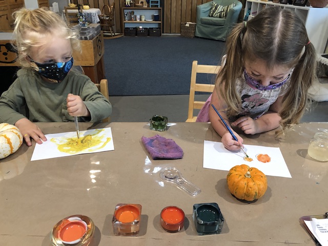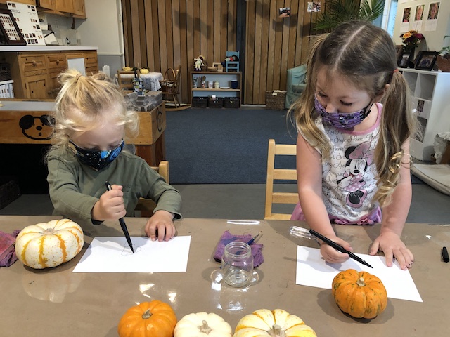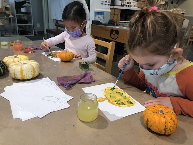 Once we finished drawing the outline of the shapes with the flair pens, the children added color with tempera paints. (The Dandelions had mixed colors earlier in the week, also using the pumpkins and gourds as inspiration for their palette!) We really slowed down the process by using the magnifying glasses to take a closer look at the colors on the pumpkins and gourds before picking up brushes.