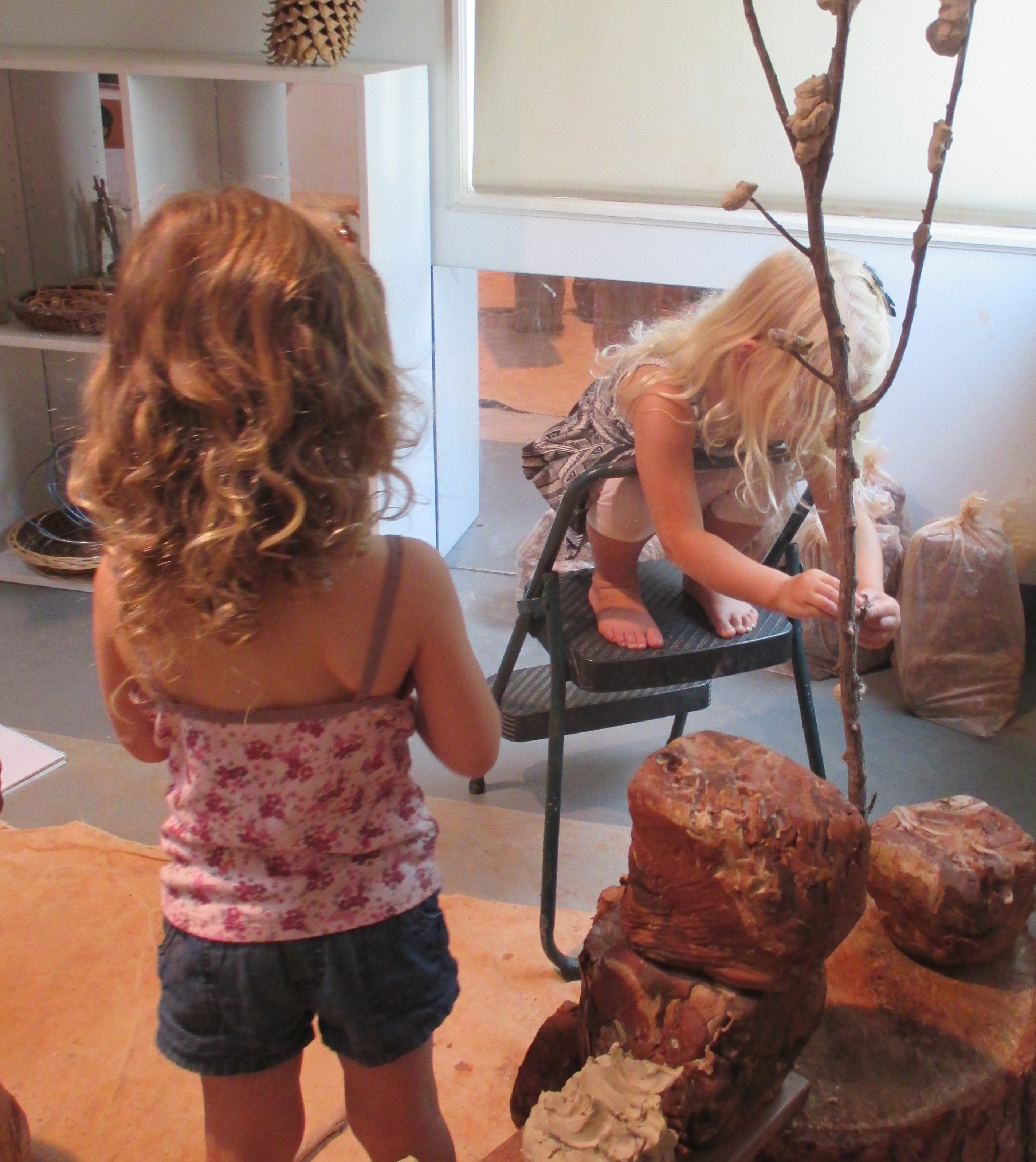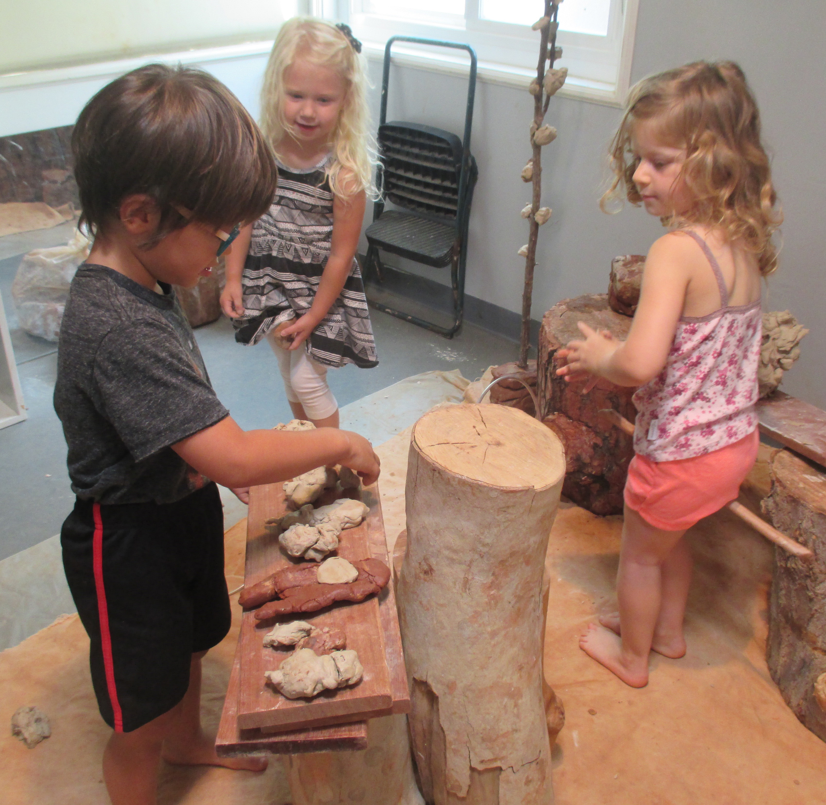 In the West Wing Exploration Room, children have been working with clay and using it as a medium to build relationships with each other and to express their ideas. When we introduced an array of natural materials (logs, branches, wood, and a barren tree) to use in combination with the clay, playful stories began to emerge. Amalia and Evera sculpted small pieces of clay and attached them to the tree. As they did this, they pretended these were talking spiders called Roly Pistons. Sol was nearby and used the clay to create a lobster.