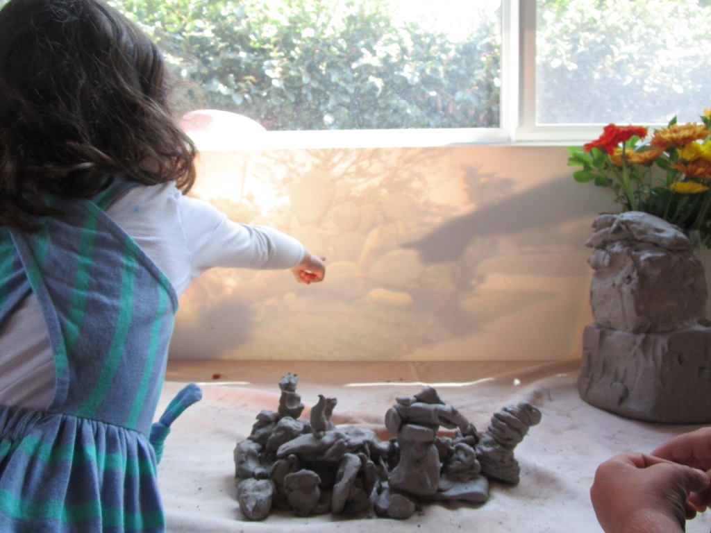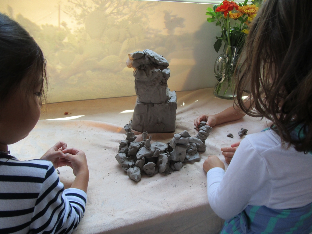 Knowing Cactusland was a favorite neighborhood destination, I projected a photo the children took of it on the wall near the clay exploration table. Small groups worked over a period of days as they familiarized themselves with this sensory-rich, three-dimensional medium. As they played, cactus representations emerged.