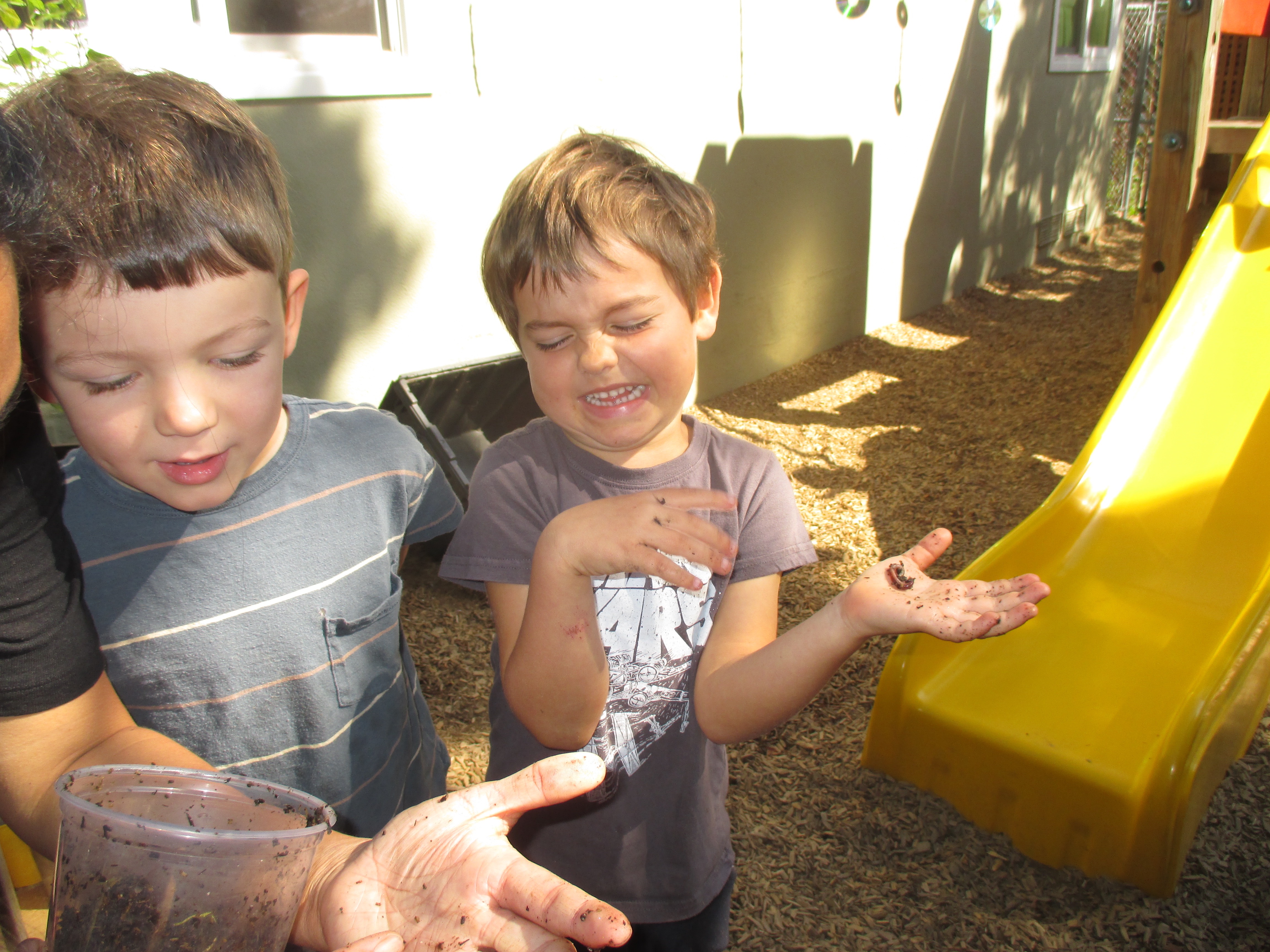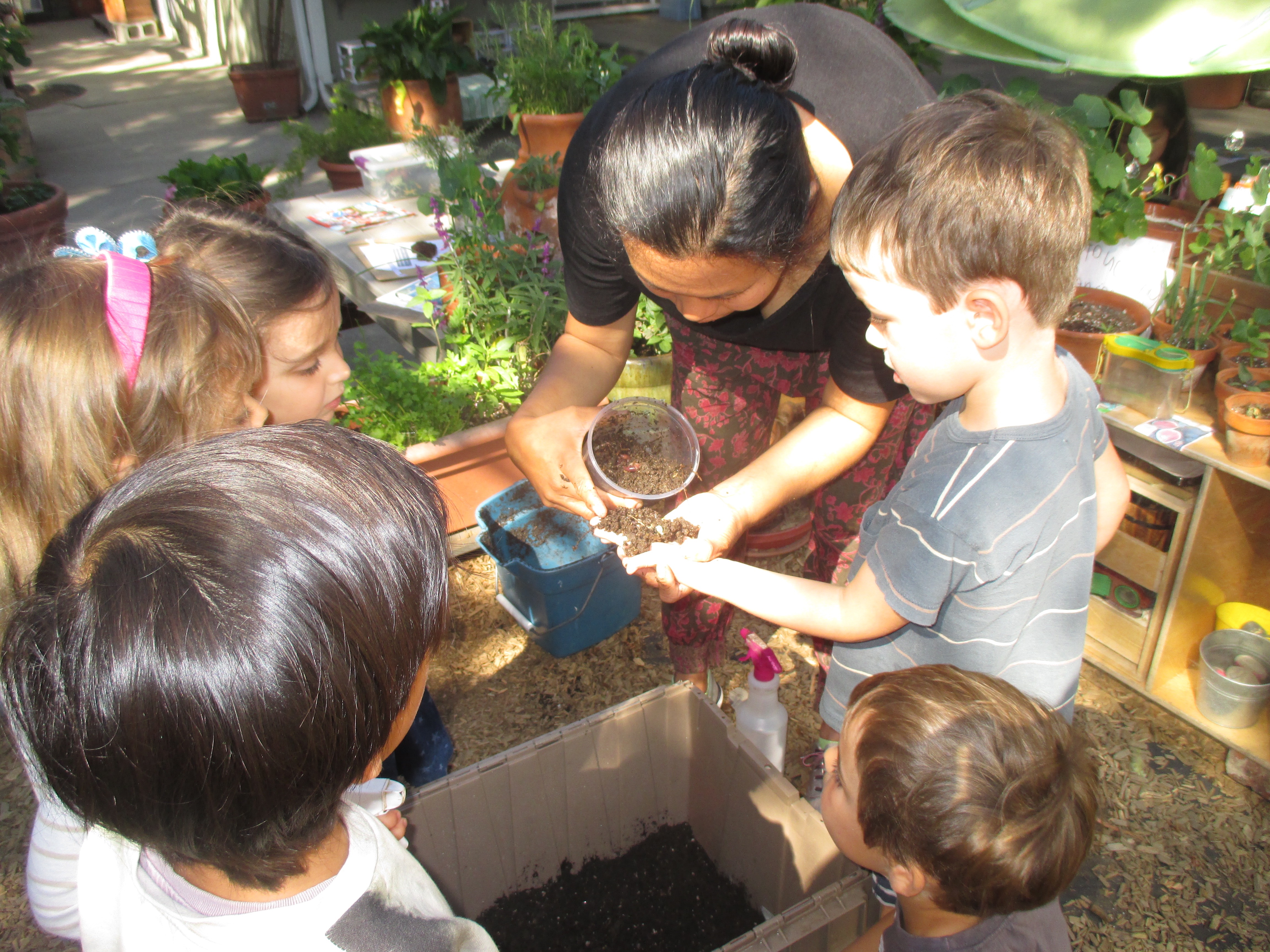 As the Front Yard area is getting more care and love from the children, the teachers are noticing their deep interest in bugs. With this in mind, the teachers thought a worm compost bin would fill in the circle from compost to edible foods.
