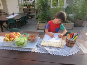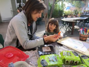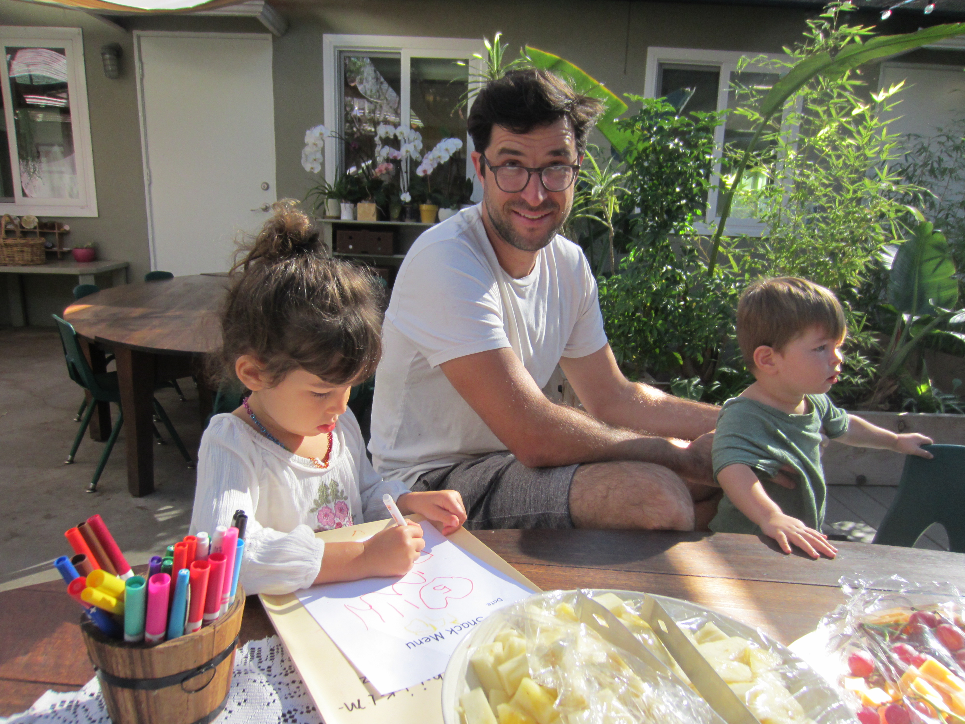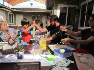 Wally (EW) with mom Rebecca and dad Lucas cooked with friends in the Middle Courtyard. Handmade noodles (regular and gluten-free) were served for the afternoon snack.
