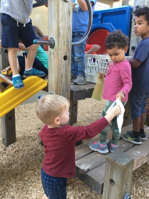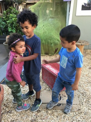 One morning, while playing in the front yard, Naomi was experiencing a sad moment. She began to cry and expressed her emotions to the teacher. It’s part of our New School-West culture to support one another and to offer a variety of avenues to the children to expresses their feelings, such as writing in their journals, making a note, or asking for support. Sometimes it’s just an affectionate gesture.