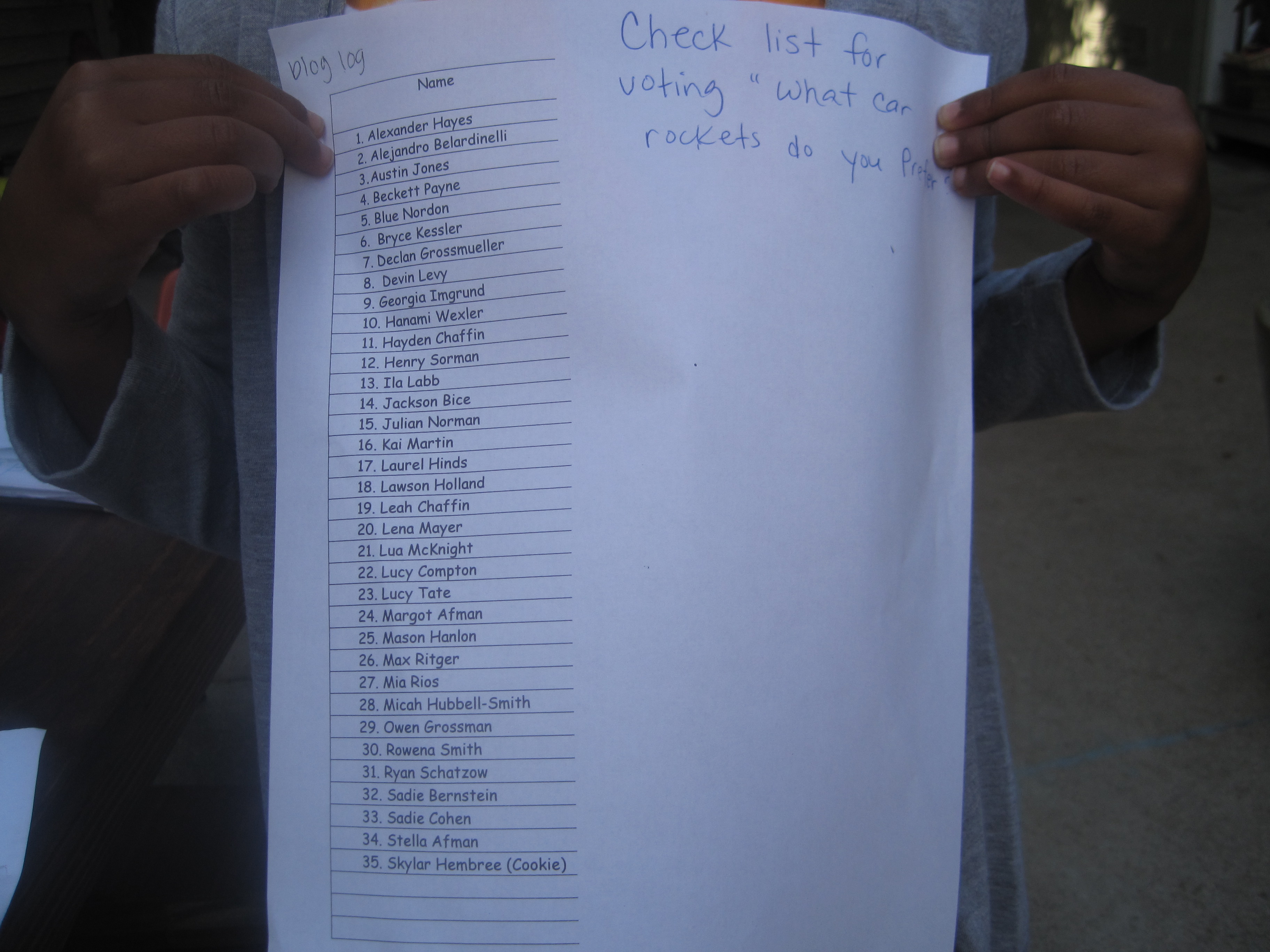 The survey was done as soon as they noticed that the new car rockets were getting the most votes. The children shared this at the afternoon meeting. The children were still concerned about people going super fast.