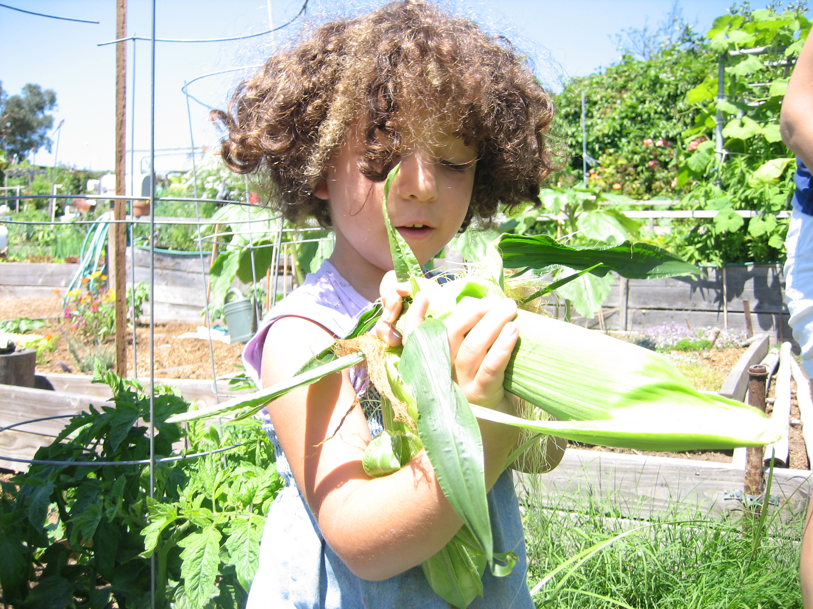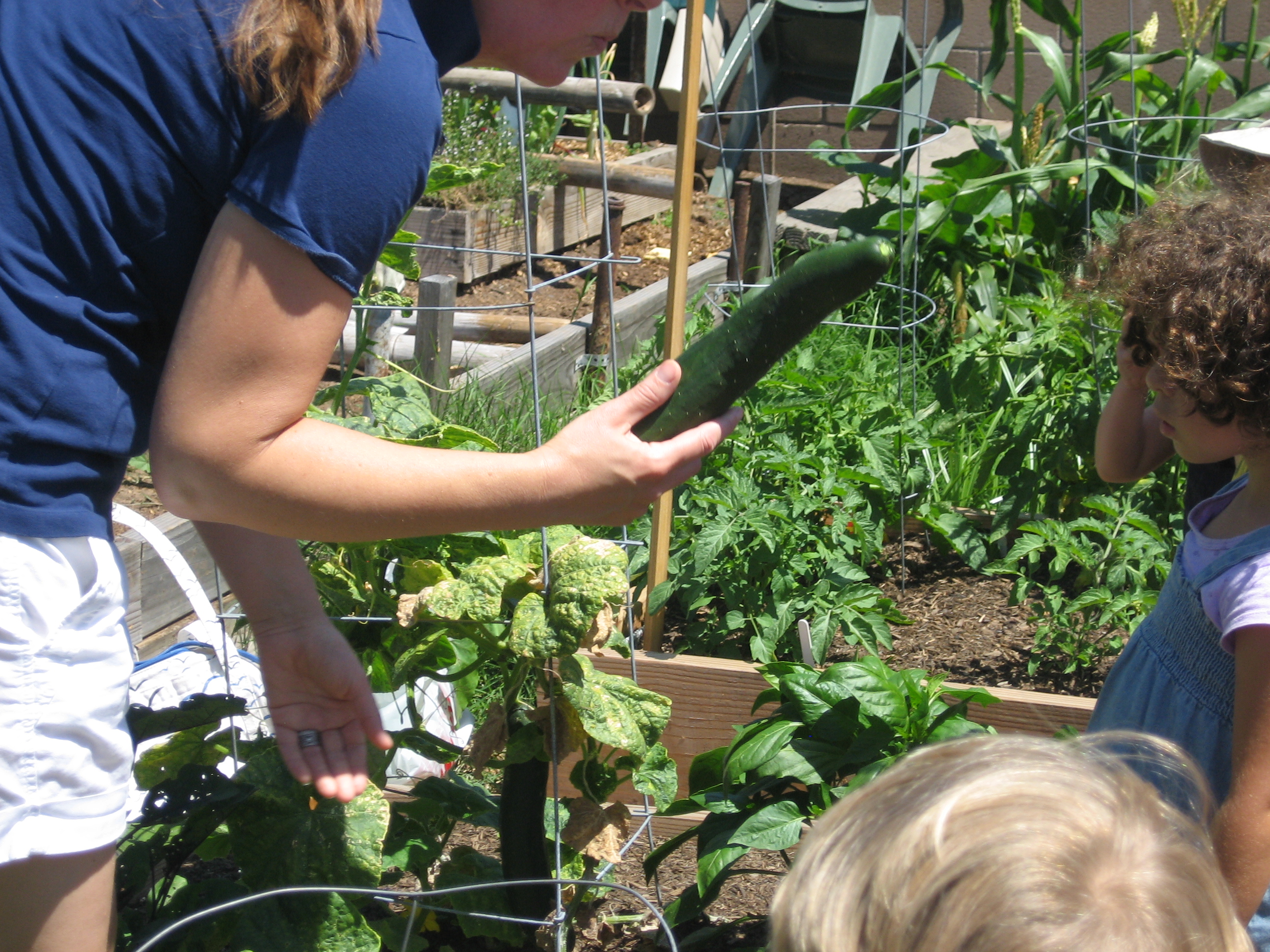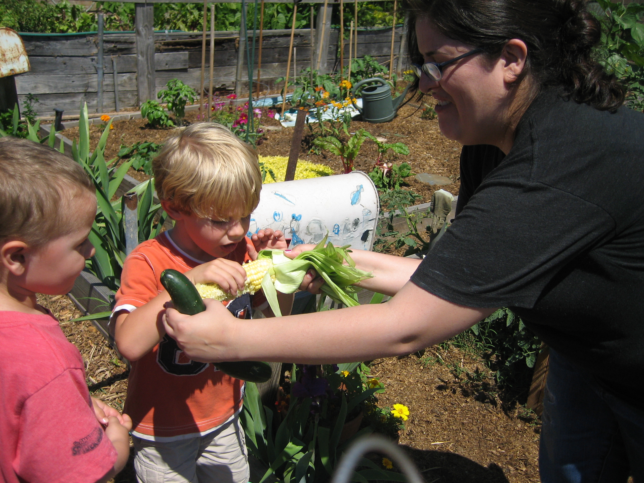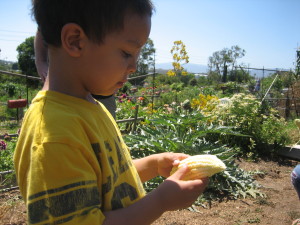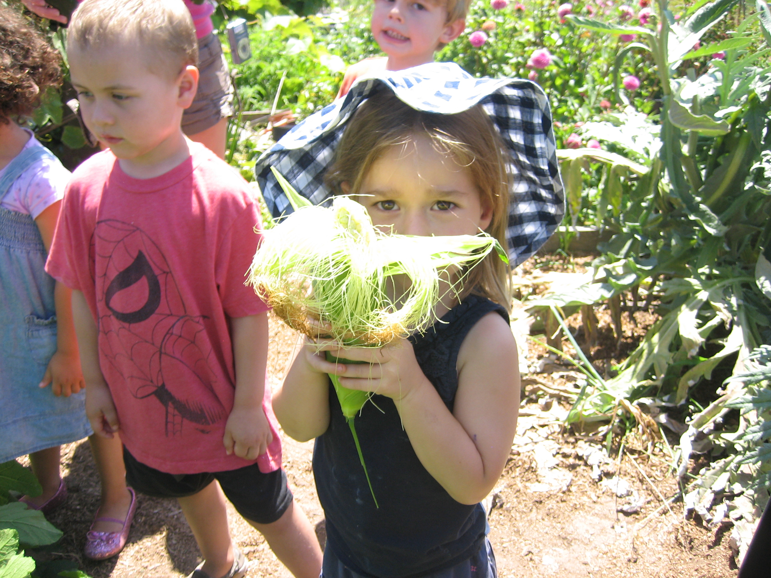 We walked through the gardens to our plot where the children discovered the cucumbers, artichokes, and corn ready to pick.