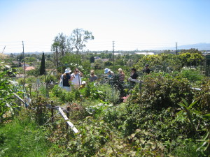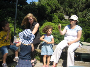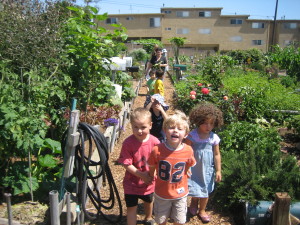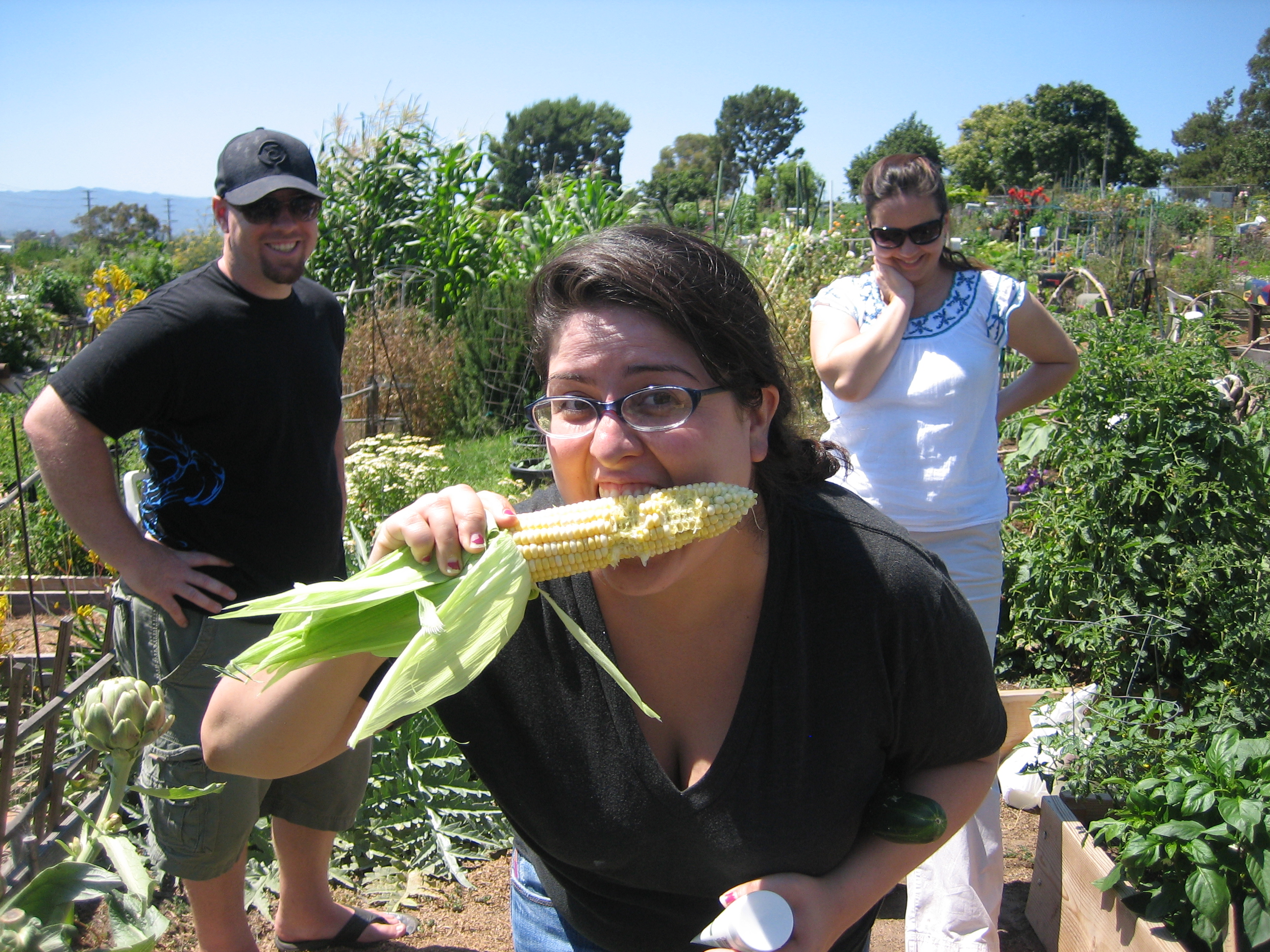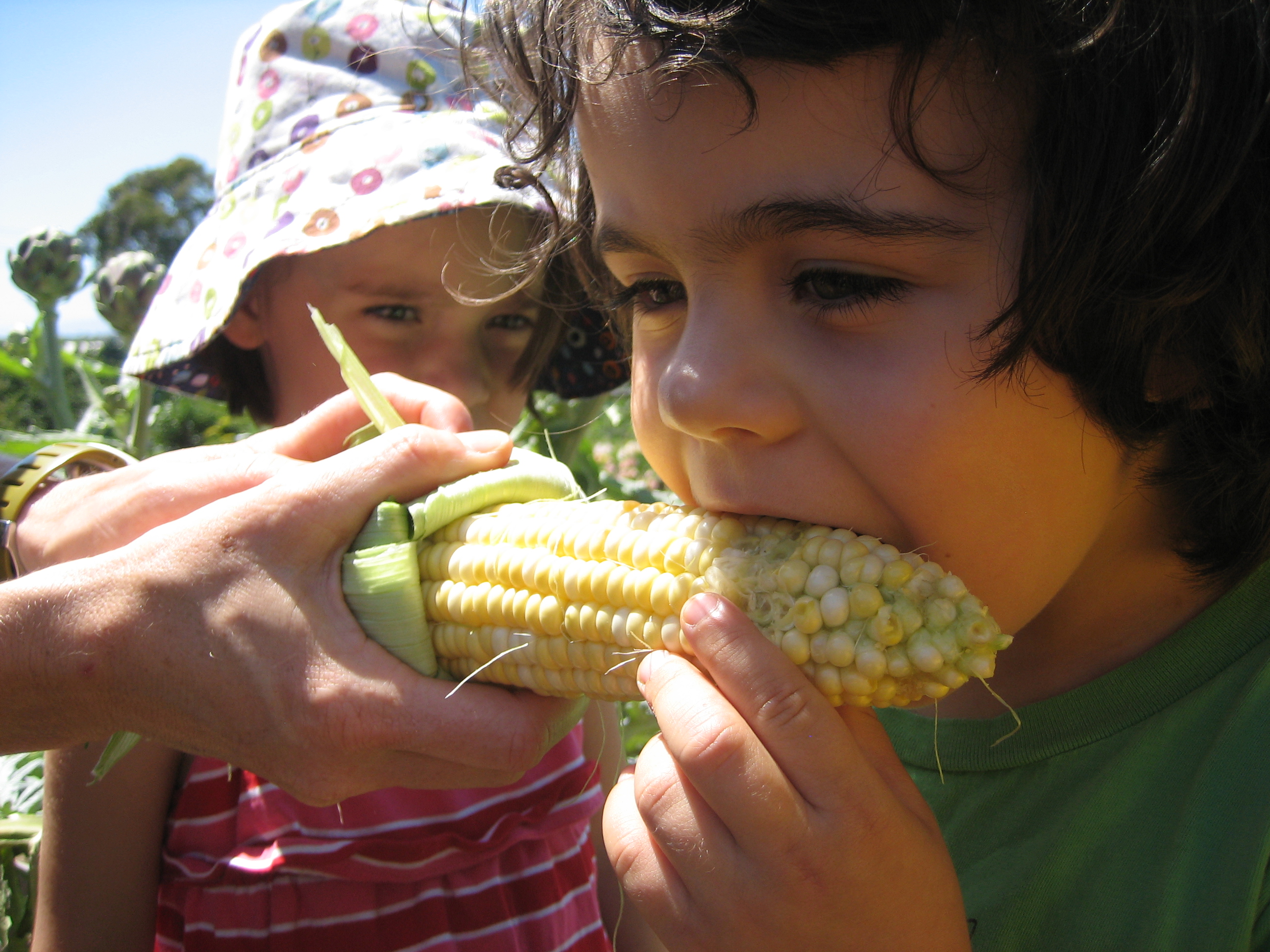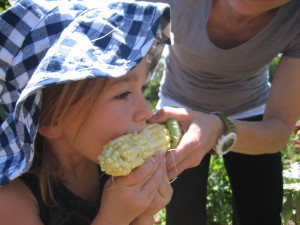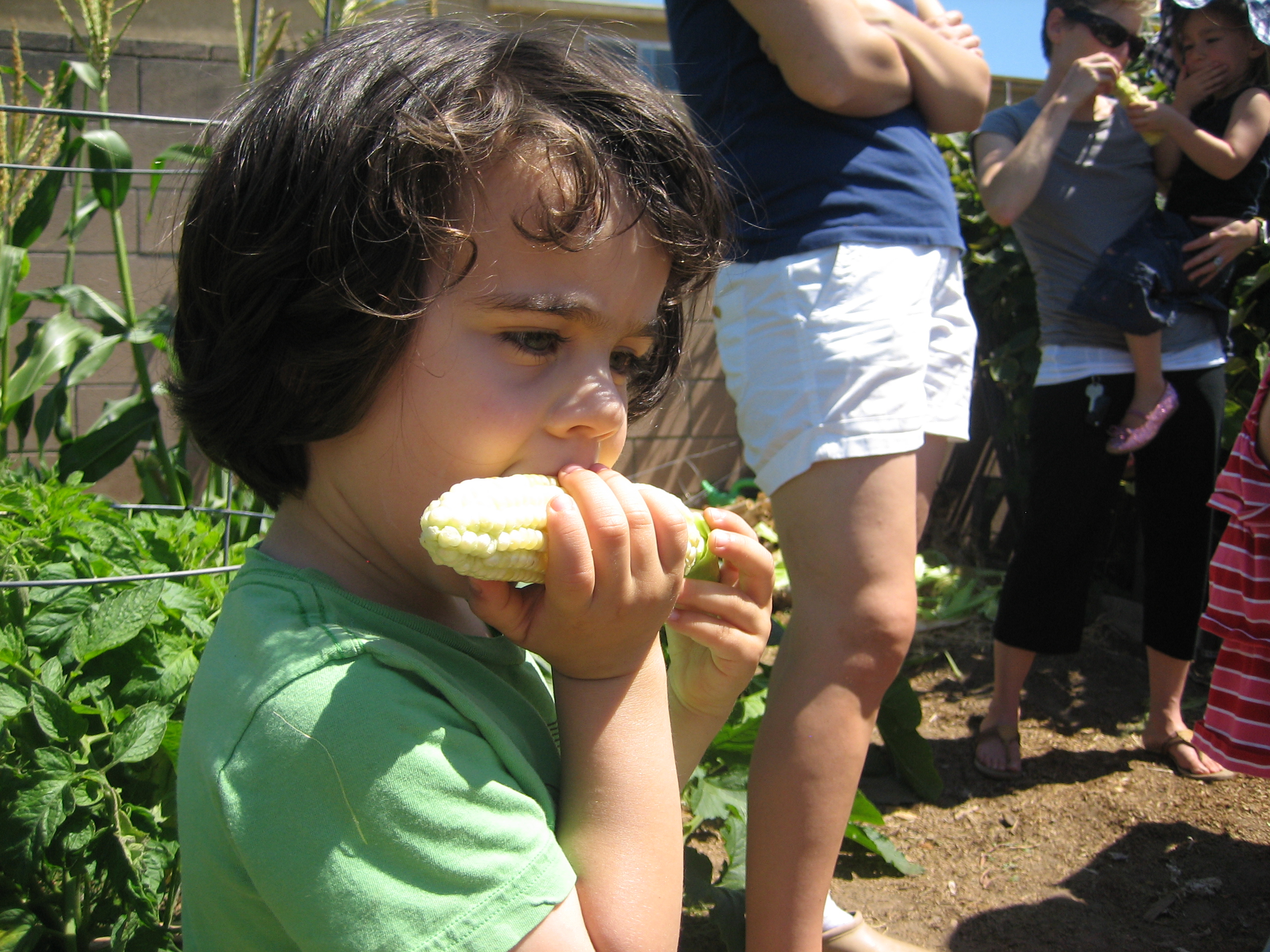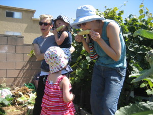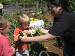 We walked through the gardens to our plot where the children discovered the cucumbers, artichokes, and corn ready to pick.