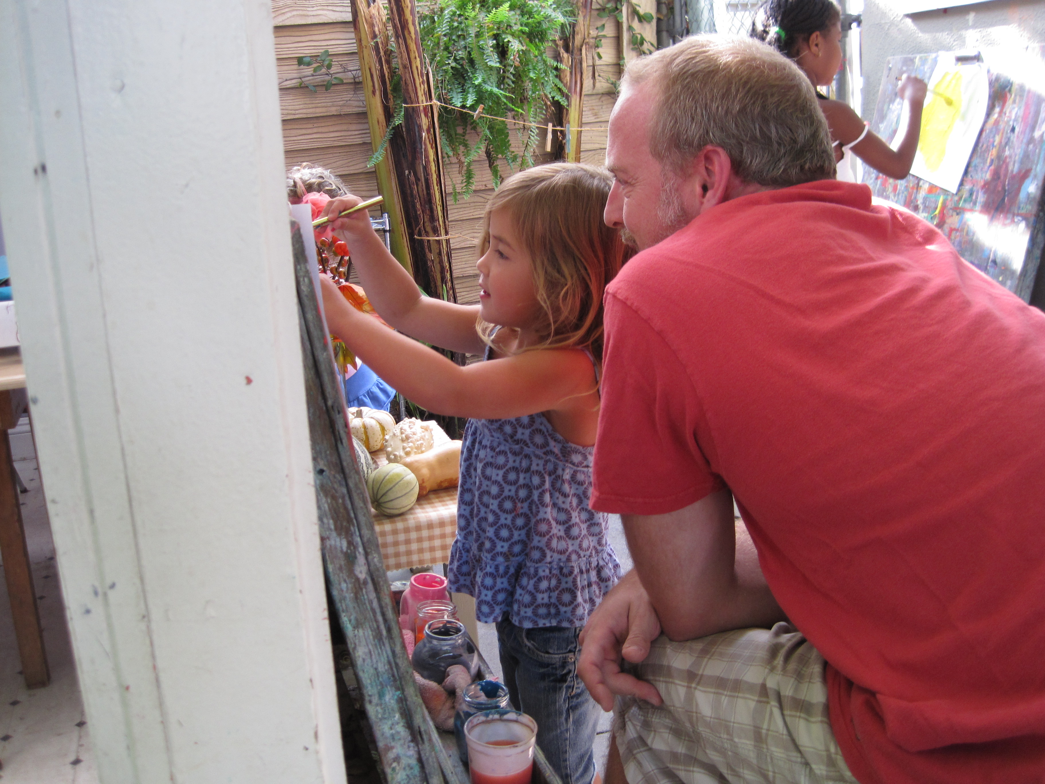 Georgia: “Like this.” She uses a dot motion to dab red paint on the yellow gourd.