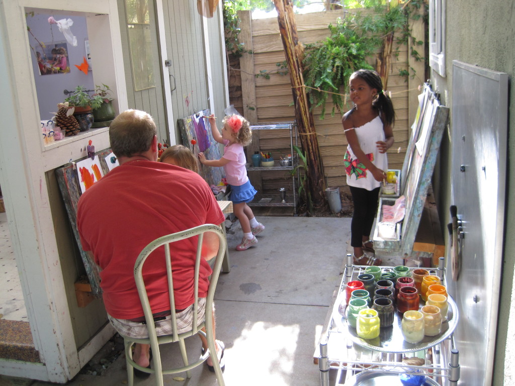 In the front yard, the teachers reassesed the easels after the parents had mixed paints to match the fall provocation provided at the WW back to school night.