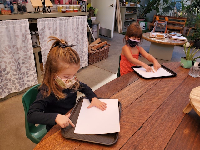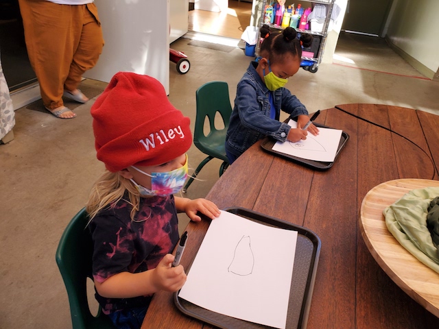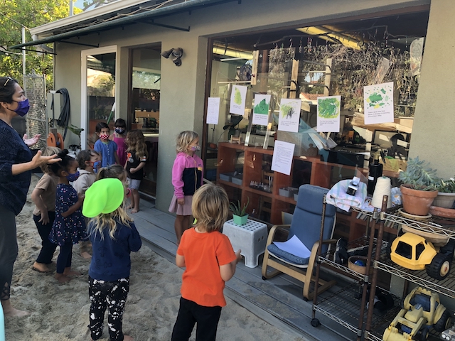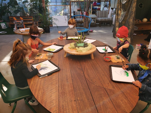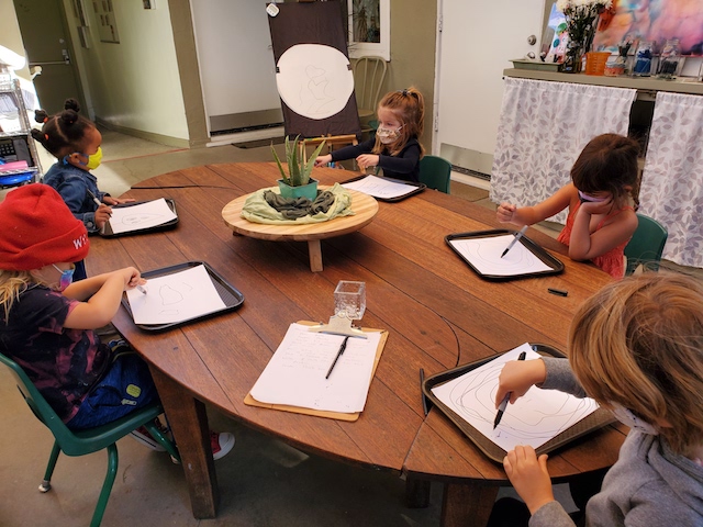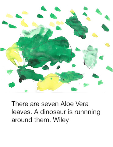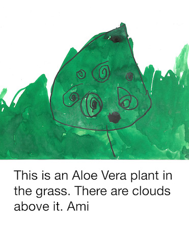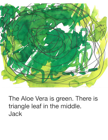 In the Middle Courtyard, a small group gathered to dictate the words for the letter. Knowing this group’s love for painting, I set up a provocation of an Aloe Vera plant to add illustrations to their thank you note. The group was surprised to know this plant was an Aloe Vera.