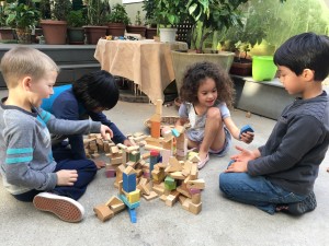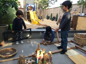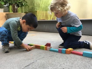 The moment we added the people to the construction space, the children began to have extended dialogues with each other. As teachers, we are always looking for when to add or take away a material to support the next level of collaboration or when to propose a question. When Aiden responded to Kayden, “How about we try until it’s like the one you imagine?”, he not only supported Kayden in implementing an idea but also inspired us to remember that in life it’s essential to stay persistent. As Kayden suggested, we are all like artists in our persistence of our vision. In the front yard, our vision for children is a connection and collaboration and how that bridges to the community. Adriana and Kristin