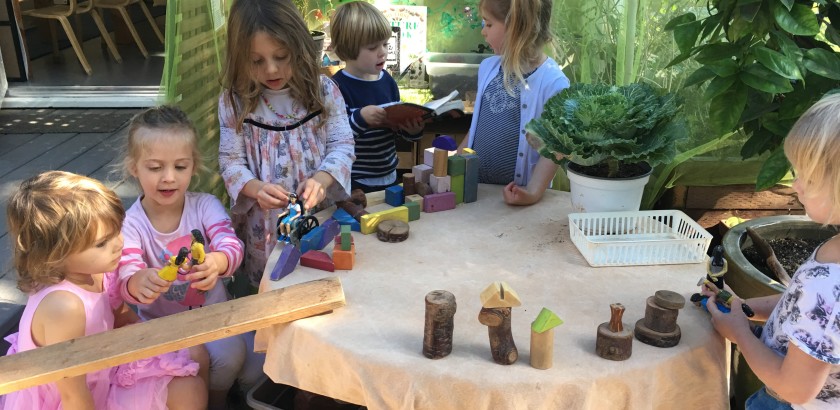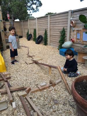 In the front yard, there are multiple building materials for construction and the teachers predict they will observe children building a relationship with each other and the tools. The teachers noticed that the children enjoyed building but recognized there was something missing and wanted to offer a social challenge to their building. We decided the addition of human figures would reveal ideas around how people live and invite dialogue.