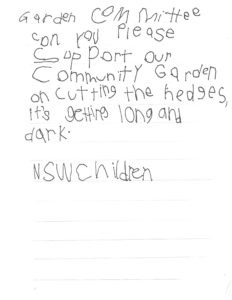 Katherine: This is a big job. Do you know that we have a garden committee of parents who want to support us? I noticed this part of the garden is very dark. The sunlight isn’t coming in.