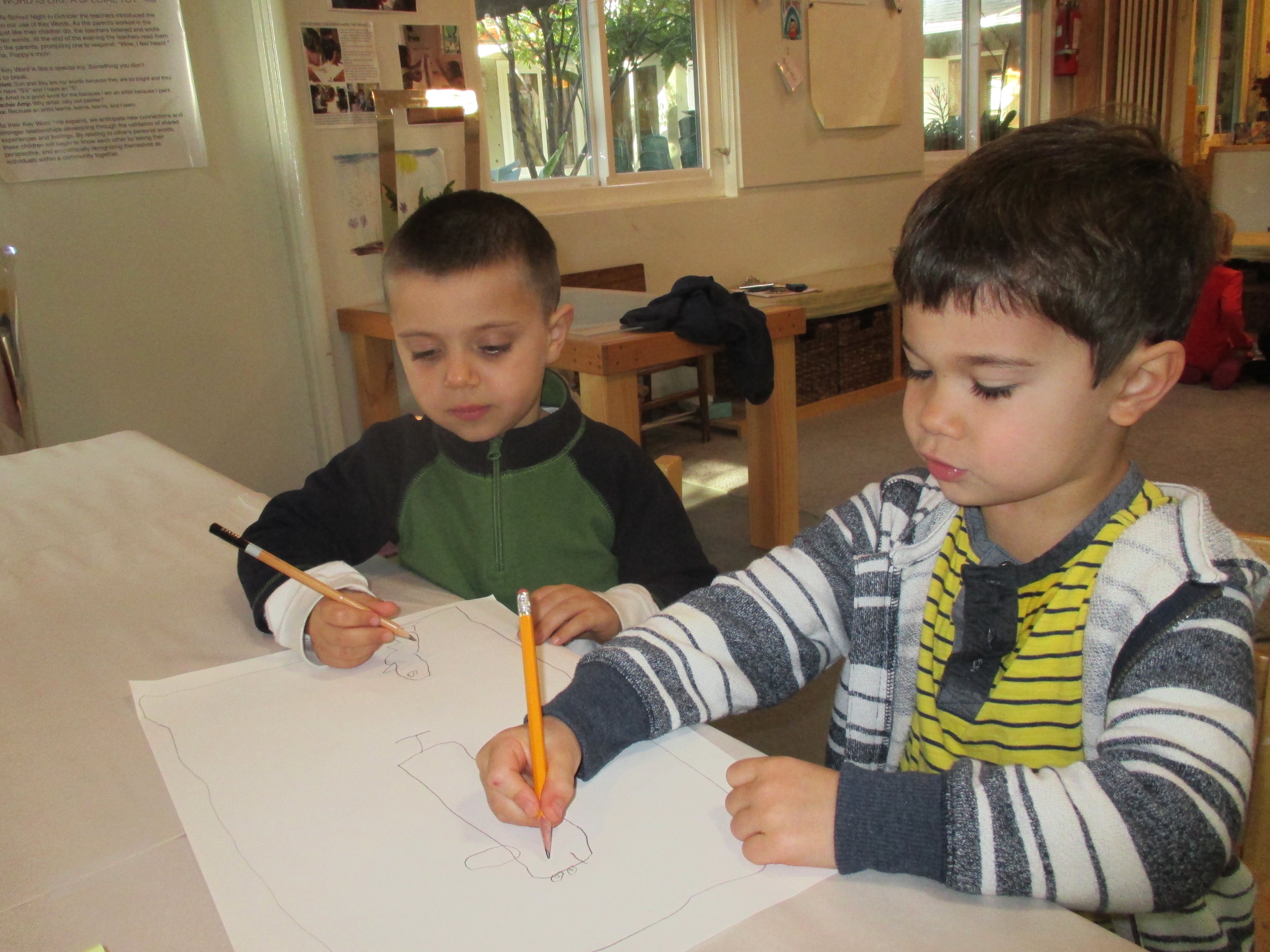 Teddy and Jai worked together as partners on a drawing. After some discussion, they agreed they would work on representing the sea. The boys first worked on a drawing and then added different elements: fish, divers, surfers, and even water bubbles.