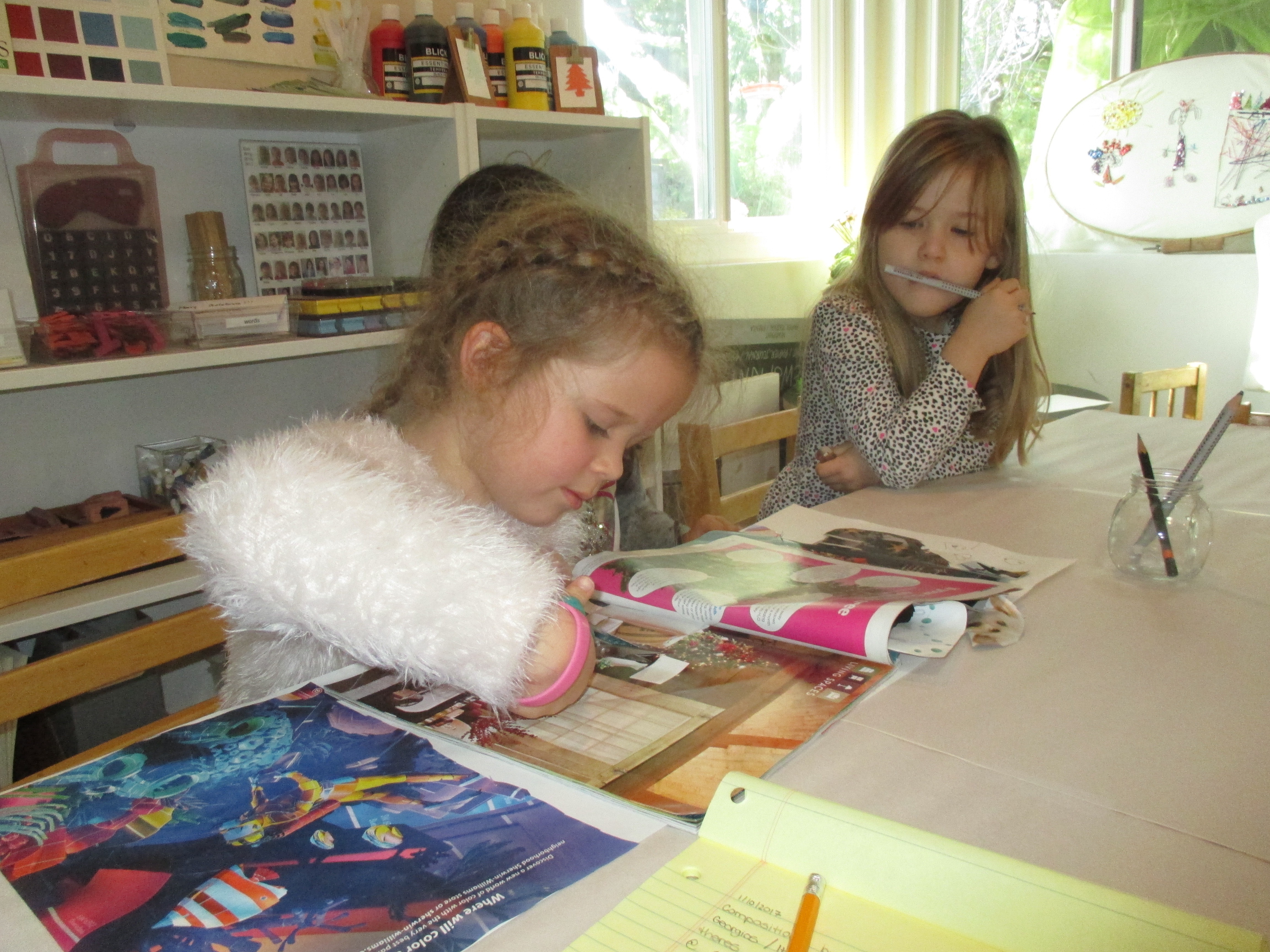 Teacher Cynthia pulling out a magazine: Do you see how there are many colors on this page? You can look for the color you need, cut it out, and then place it on your drawing where you wanted that color to go.