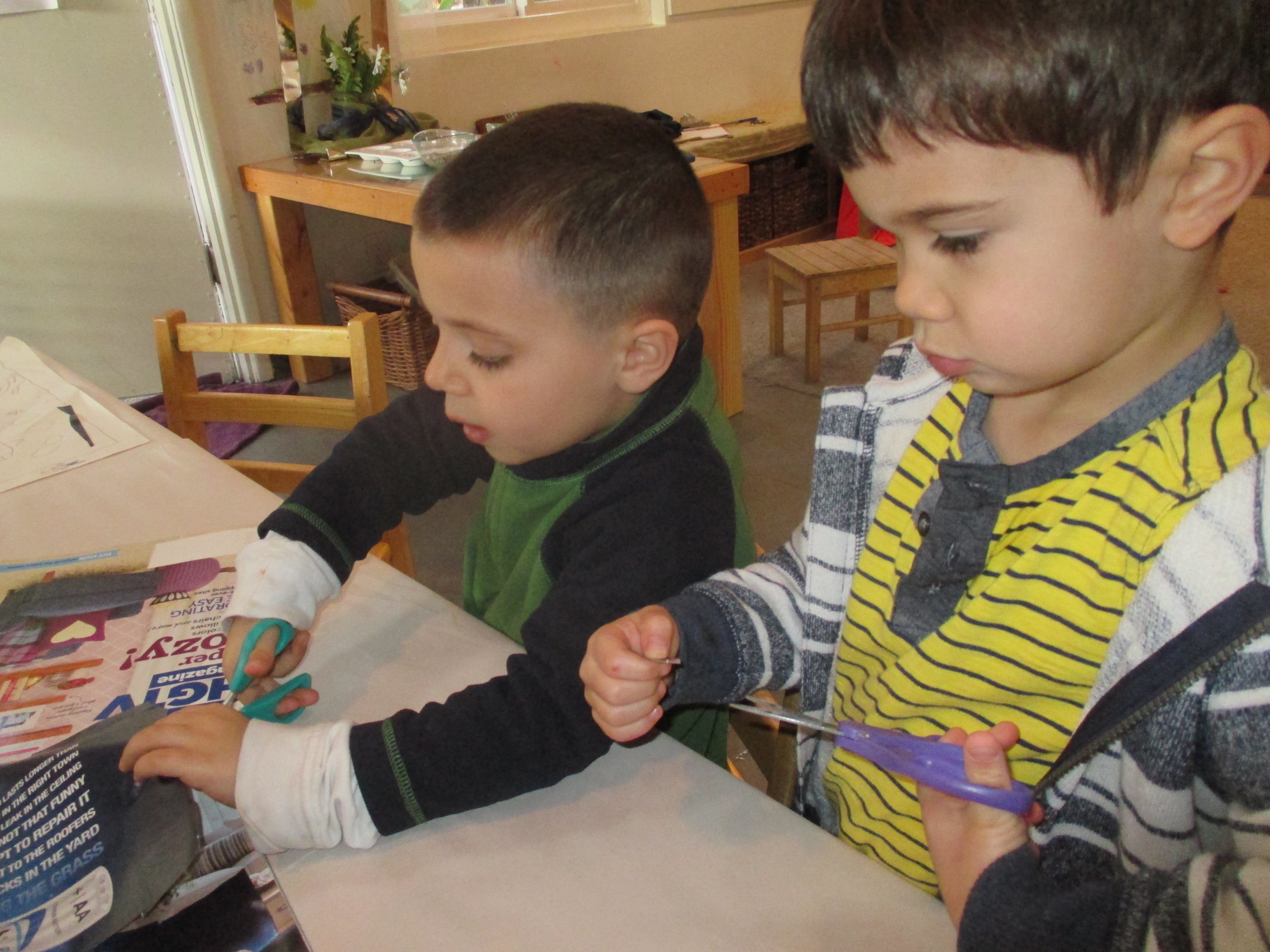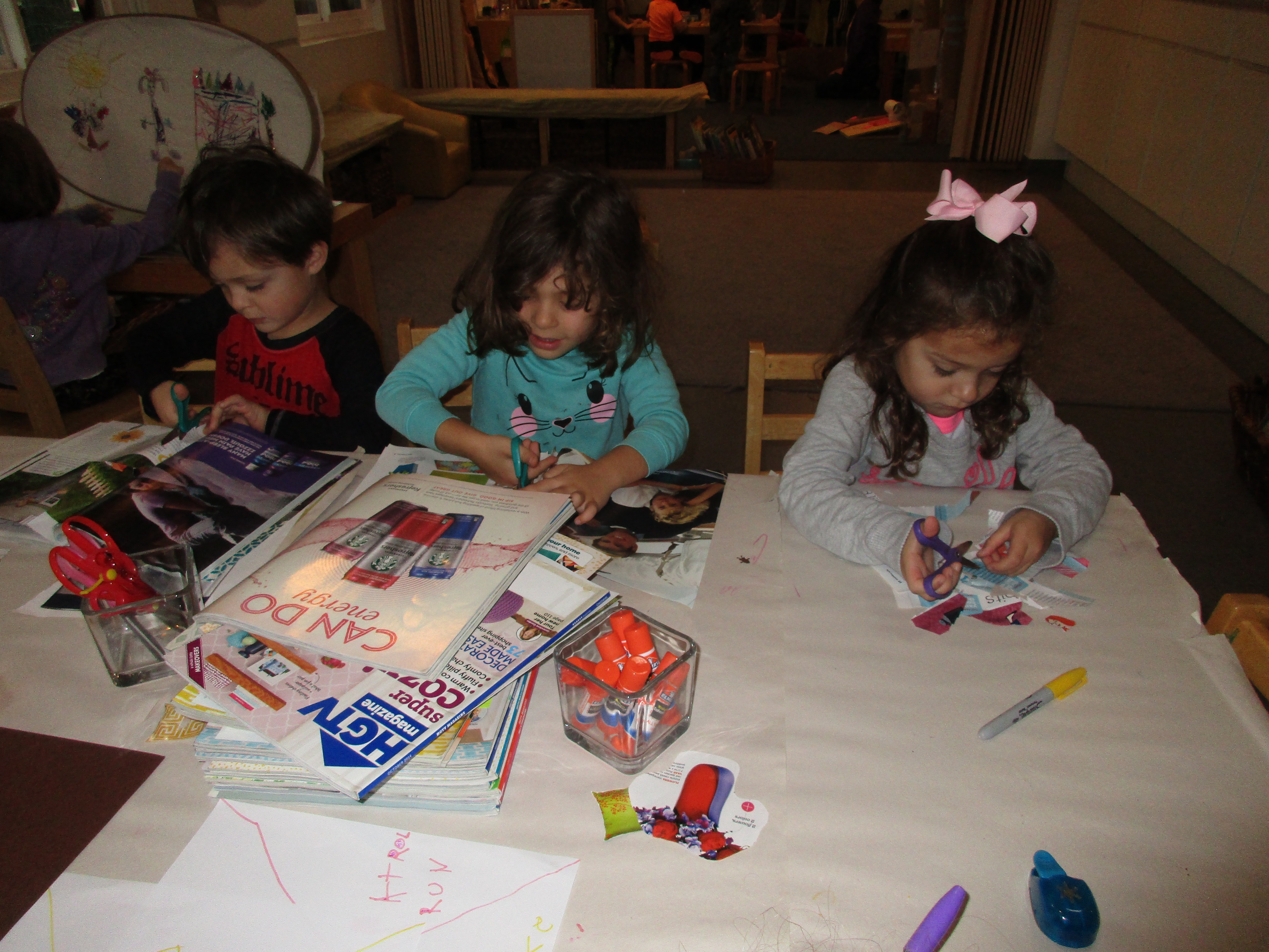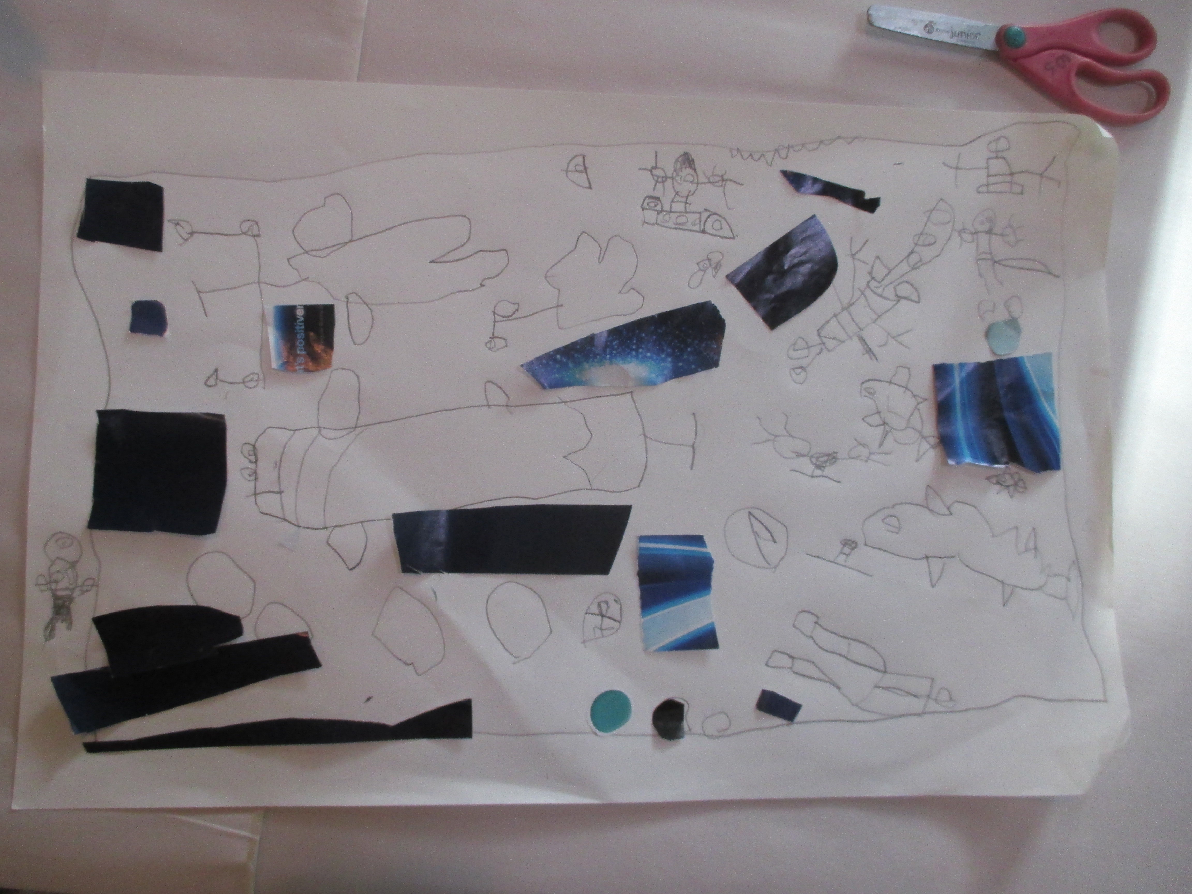 As teachers, we are always looking for different opportunities for complexity to support children’s thinking about the limitless ways of expression available. By not using glue in this initial process, the children can move things around and consider different options as they construct their story. We are still in the process of gathering all the pieces needed for the ocean. As we observe, we’re wondering how the two approaches to collage (one precise, one flexible) will collaborate in the telling of the sea. This type of collage is slowly becoming a part of the mini studio and is adding to the layers of resources in the children’s material library. -Teacher Cynthia, Kris