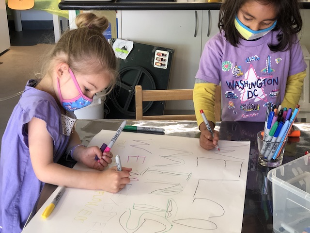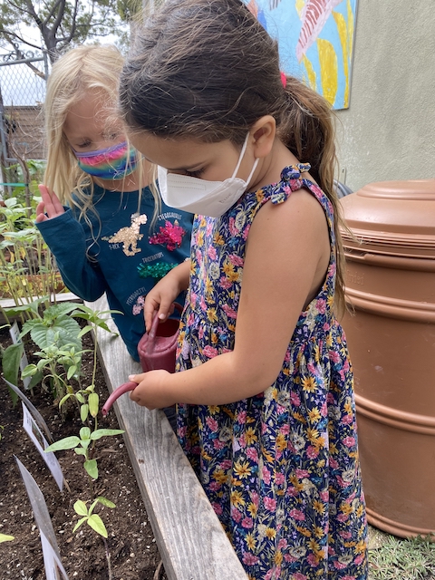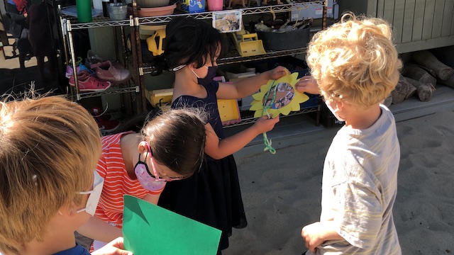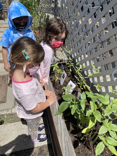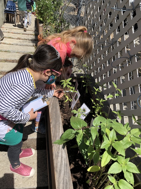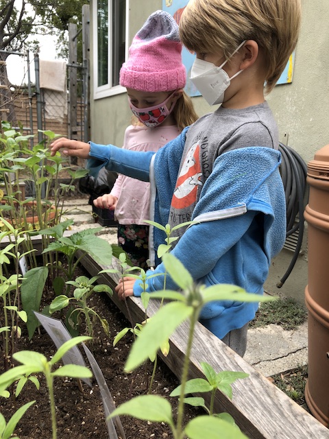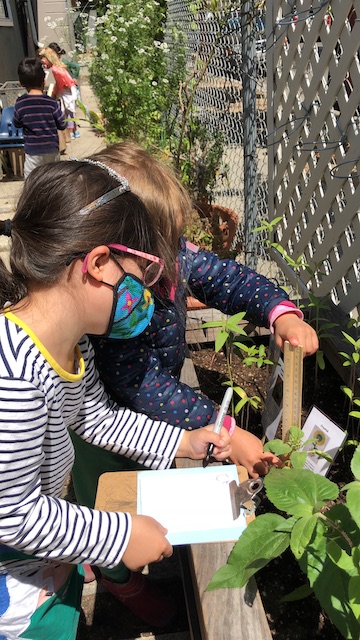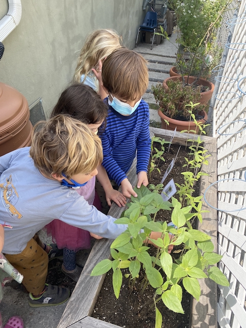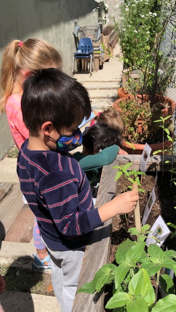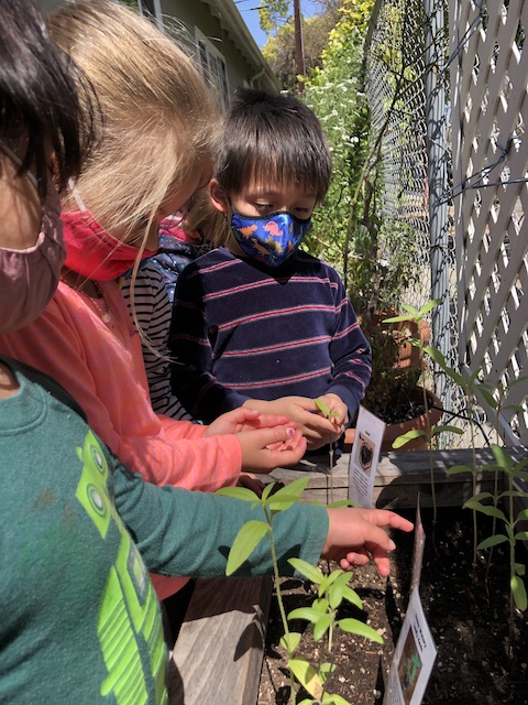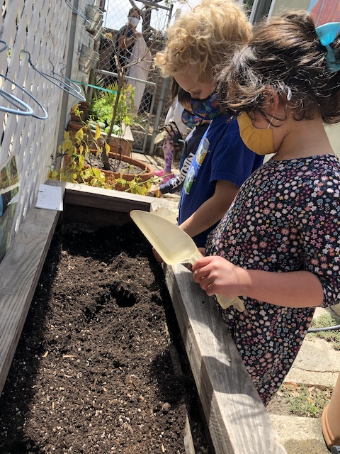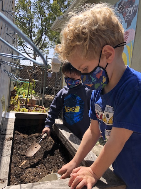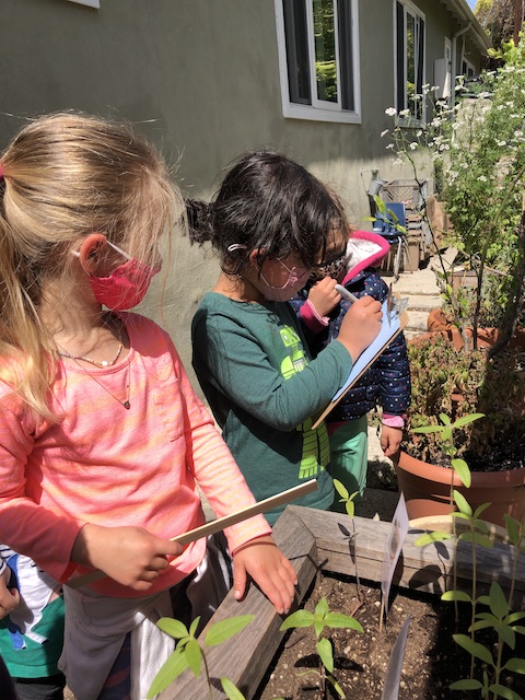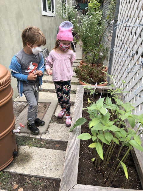 Our Aloe friends have been working closely with the children in the Mint group via Zoom, note making, videos and photographs. A few months ago, the Mints began growing sunflower seeds. With the Aloes, they have been exploring and testing different methods to support the sunflowers to grow. This past Saturday, April 17th, the Mints and their families transplanted the sunflowers into our community garden. The East Wing children made sure the school and community garden were ready to welcome their friends.