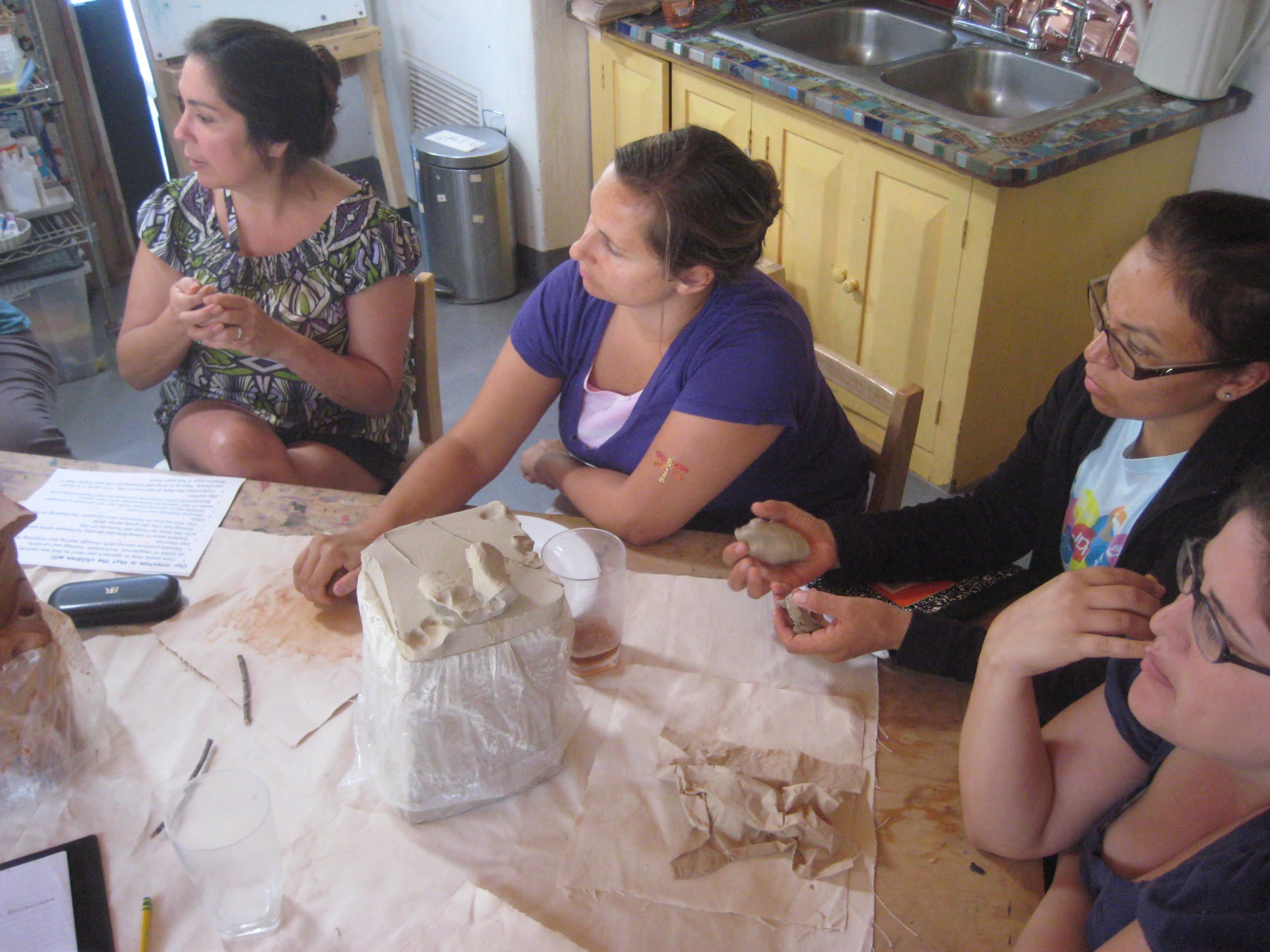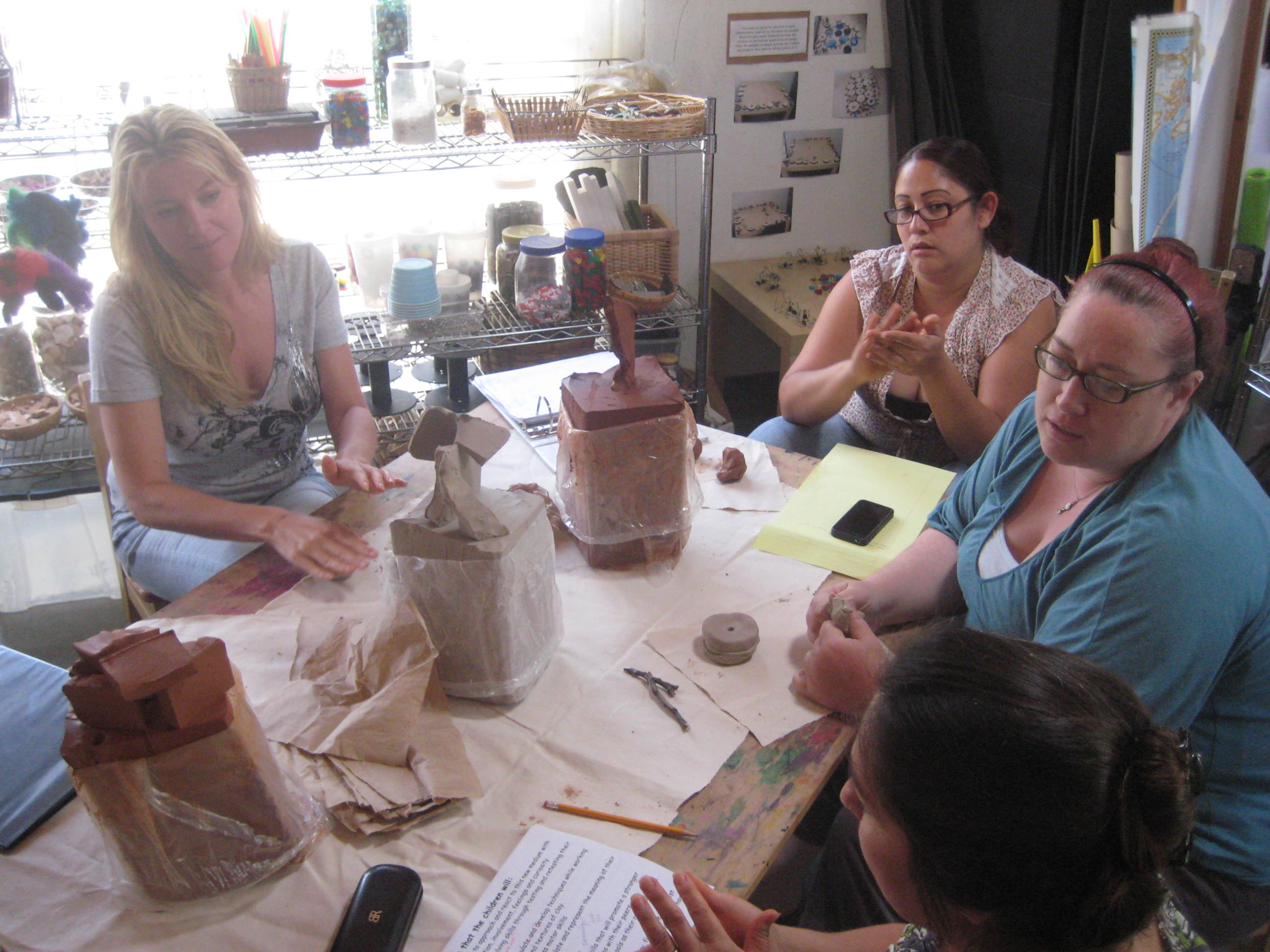 This staff meeting, we shared experiences with clay. Cindy and Kris picked up different varieties of clay from Linda at Peachtree Pottery on Boise and Venice. The teachers discussed terms, possibilities and strategies for working with East and West Wing children and clay this week.
