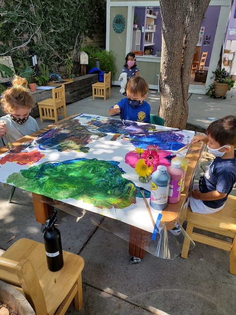 Our setup included primary colors in large bottles waiting to be squeezed by the children, along with paint brushes and rollers in addition to hand painting. Teachers intentionally layed down one large piece of paper with the purpose of inviting a sense of community. With just one bottle of each color, the children needed to reach out to their peers for the color they wanted to mix next. Negotiating, communications and turn taking is practiced along with waiting.  These learning exchanges are facilitated by the teachers mostly in the beginning as part of our school culture. We guide children to use their voice to ask for what they need and to listen to others’ requests. We sanitize their hands and bottles to enable these moments to happen.