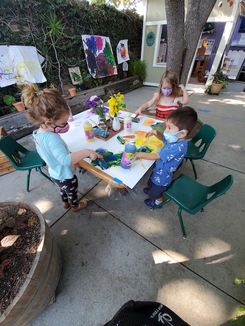 With the intention to bring comfort to the children through familiar routines in the school environment, the Dandelion teachers’ initial activities in the Front Yard included paint exploration in small groups. Considering that the children’s bodies need to keep a physical distant, we wondered what kind of interactions the children would experience together while physically apart?