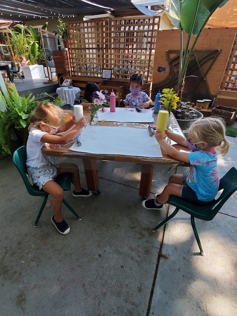 With the intention to bring comfort to the children through familiar routines in the school environment, the Dandelion teachers’ initial activities in the Front Yard included paint exploration in small groups. Considering that the children’s bodies need to keep a physical distant, we wondered what kind of interactions the children would experience together while physically apart?