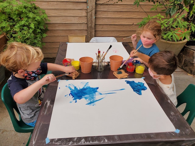 With the intention to bring comfort to the children through familiar routines in the school environment, the Dandelion teachers’ initial activities in the Front Yard included paint exploration in small groups. Considering that the children’s bodies need to keep a physical distant, we wondered what kind of interactions the children would experience together while physically apart?