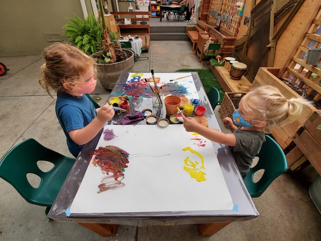 Our setup included primary colors in large bottles waiting to be squeezed by the children, along with paint brushes and rollers in addition to hand painting. Teachers intentionally layed down one large piece of paper with the purpose of inviting a sense of community. With just one bottle of each color, the children needed to reach out to their peers for the color they wanted to mix next. Negotiating, communications and turn taking is practiced along with waiting.  These learning exchanges are facilitated by the teachers mostly in the beginning as part of our school culture. We guide children to use their voice to ask for what they need and to listen to others’ requests. We sanitize their hands and bottles to enable these moments to happen.
