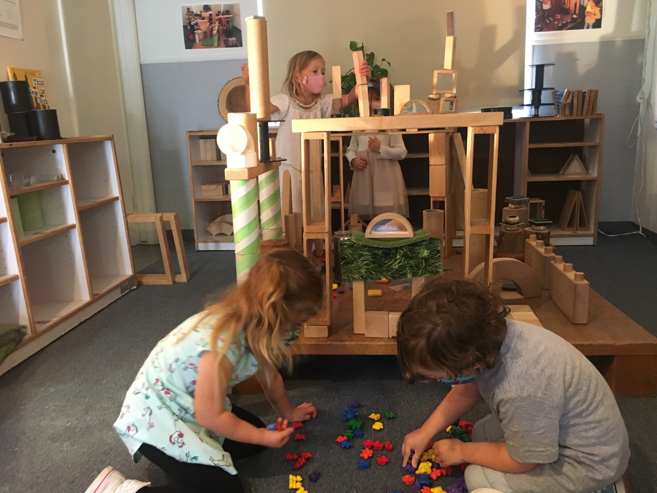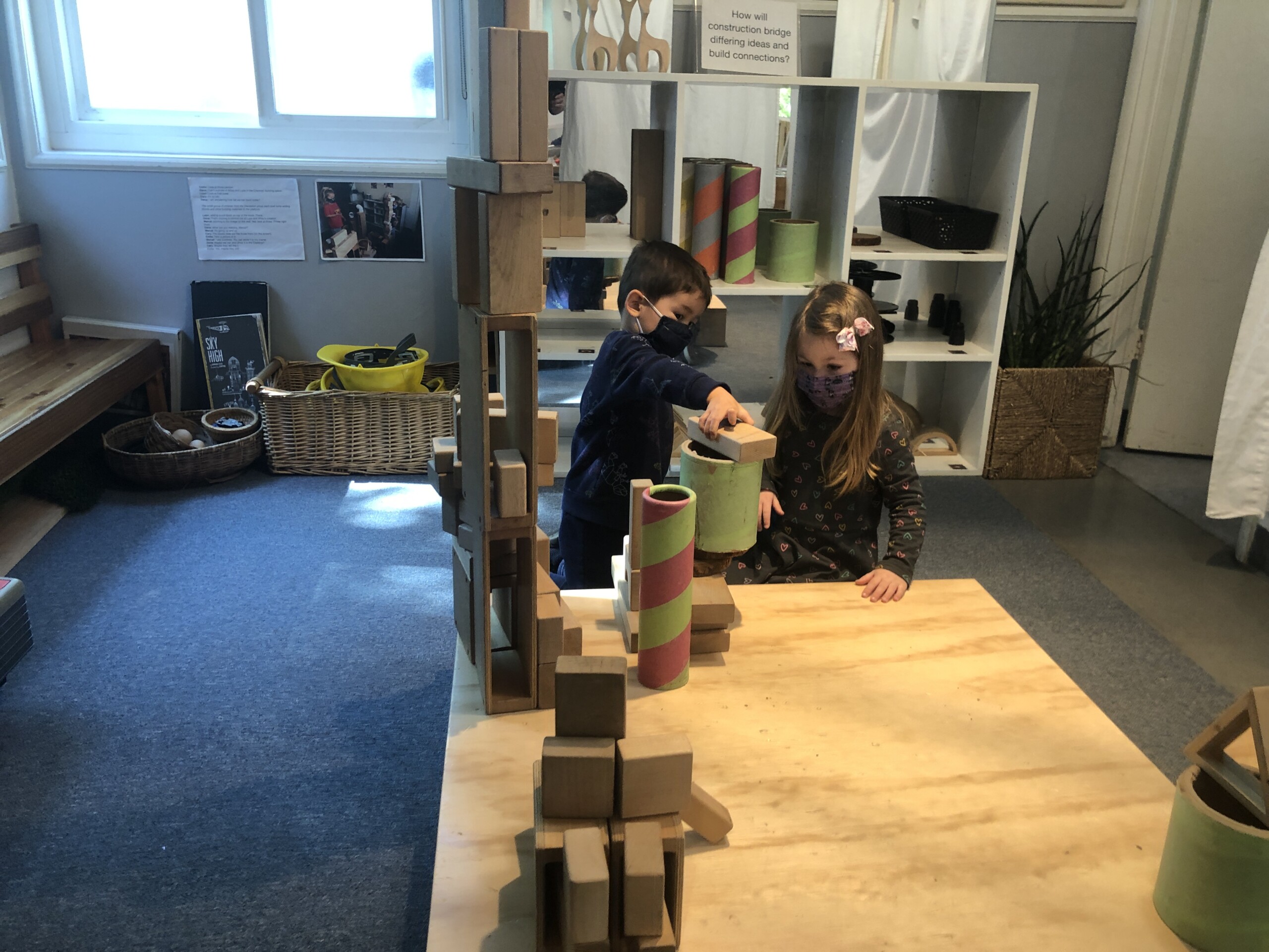 Children used the Building Space to create a forum for their imaginative play. They collaborated on familiar structures, from skyscrapers to bridges, with the idea to build New York City for the bear figurines. Play with these constructions allows the children to integrate information they have about the world around them, as well as to share new information with their peers.