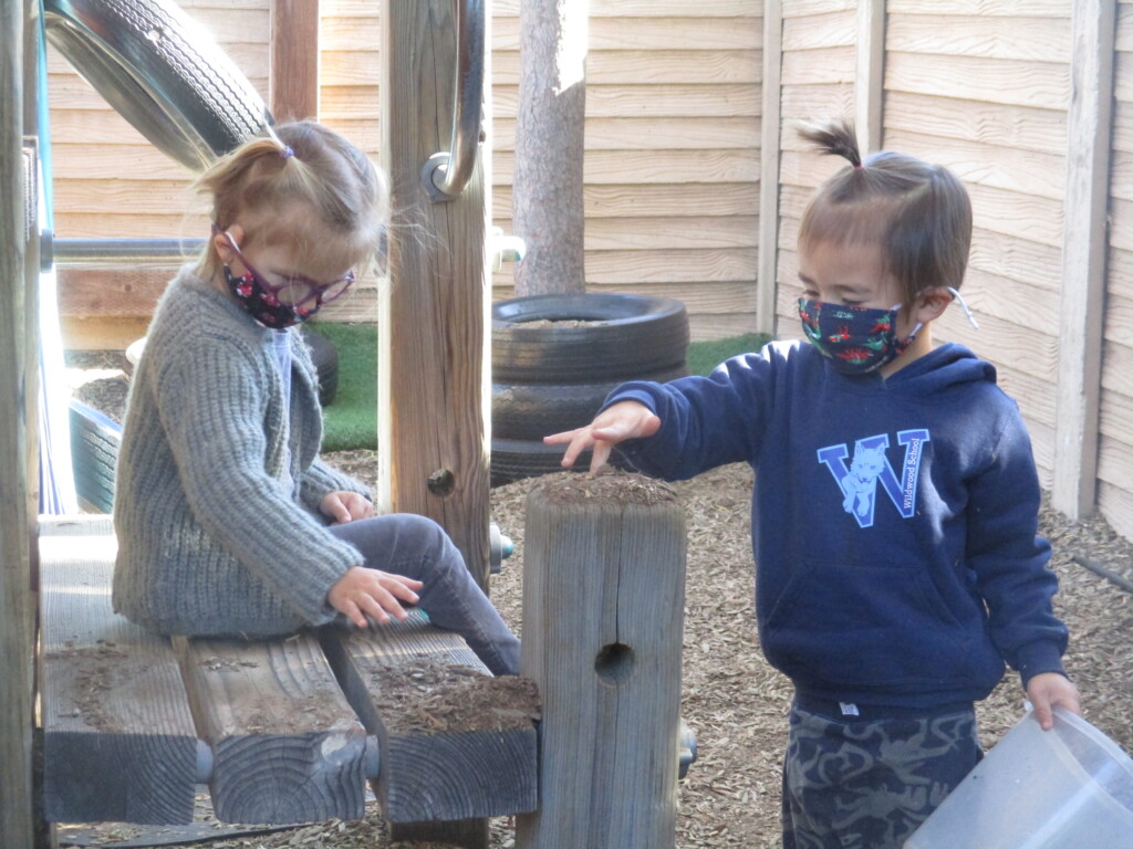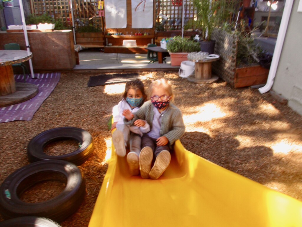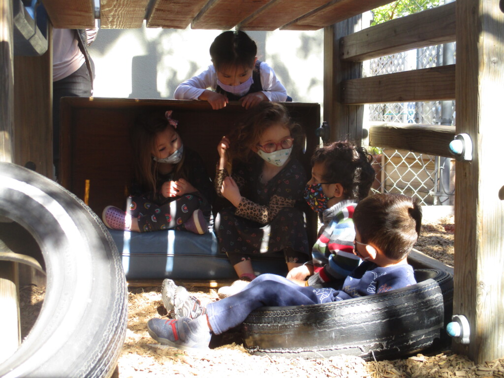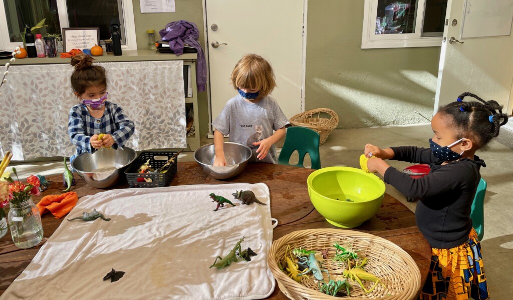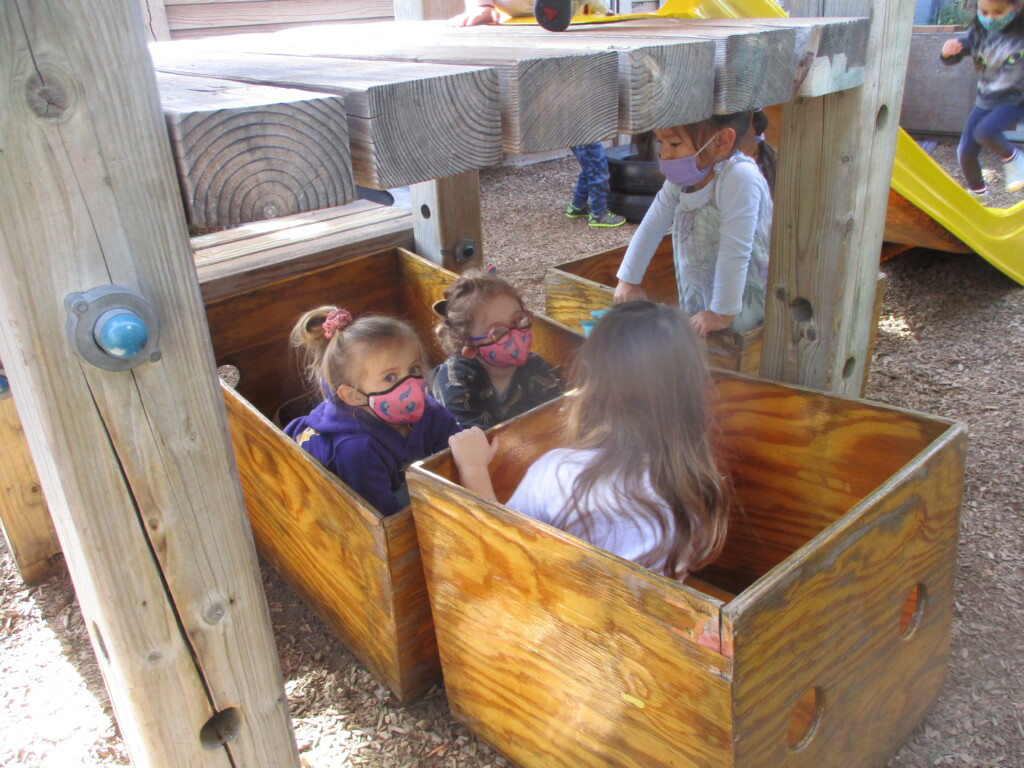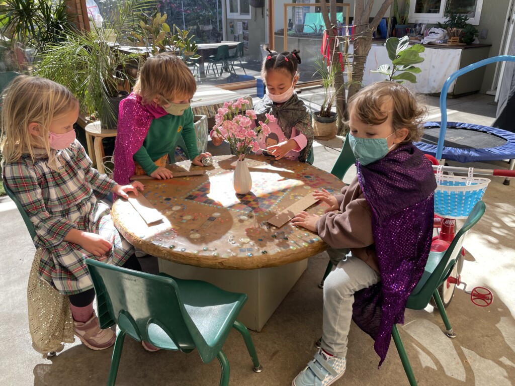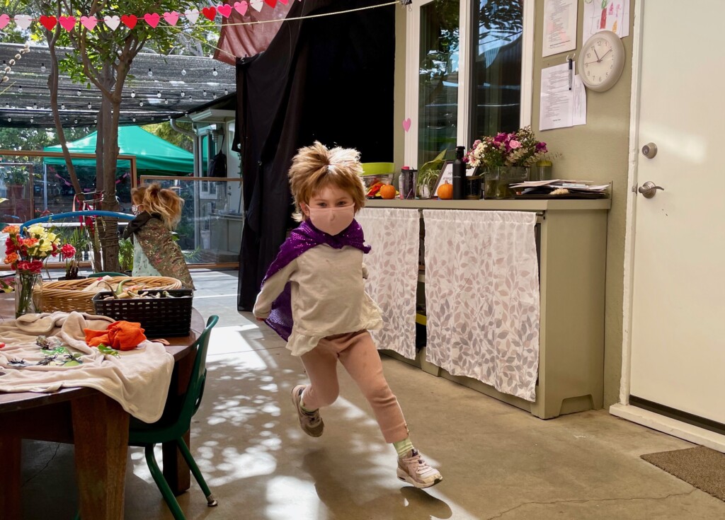 Free play provides us with a wonderful window into the minds of our children. Engaging in unstructured play time encourages children to use their imagination, boost their physical strength, and learn to effectively communicate. Different play schemas merge together as their play evolves. The Cilantros often integrate or alternate between family and fantasy roles. Opportunities for problem-solving transpire as they figure out– what is their possible new role, what are the roles their peers are taking, and how do they contribute to the narrative. Time and again children are faced with how to approach a disappointing or frustrating situation as they navigate through their play. The challenges that arise are opportunities to develop the skills on how to regulate their own emotions while becoming sensitive to the values and needs of others. When children participate in pretend play that requires more complicated interactions with their peers (cooperation, collaboration, sharing, negotiating) they are practicing and strengthening their abilities to connect to other people in healthy, productive ways that will benefit them their entire lives.