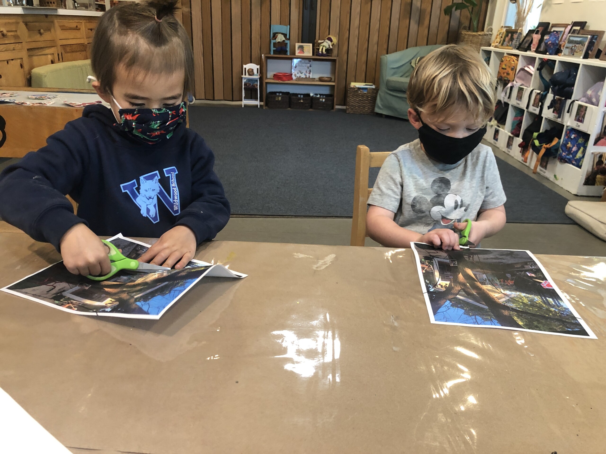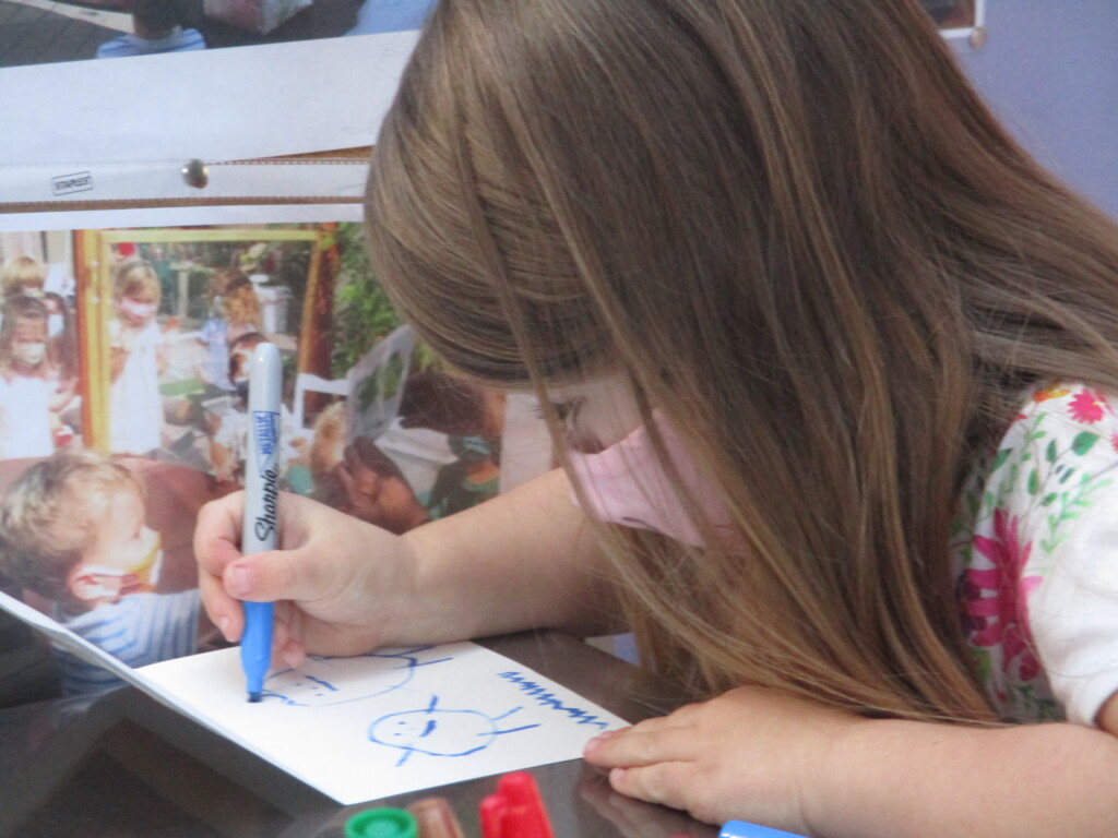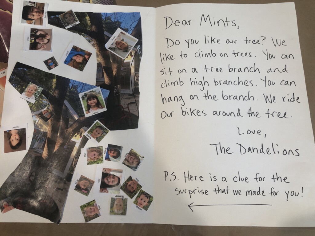 Later this week, a group of the Dandelions got to work creating the note — with the clue to where the surprise would be — in the Mini Studio. The children looked closely at some large photographs of the tree in the front yard, and on the front of the card, they drew the shapes that they saw with some black Sharpies and added the colors they observed with some oil pastels. Inside the card, they cut out some pictures of the tree and added small photographs of all of the Mints and the Dandelions. Finally, at Thursday’s Reflection Meeting, the Dandelions worked together to come up with the words of the message that would accompany the drawings and pictures: “Dear Mints, Do you like our tree? We like to climb on trees. You can sit on a tree branch and climb high branches. You can hang on the branch. We ride our bikes around the tree. Love, The Dandelions.” We are looking forward to hearing back from the Mints!