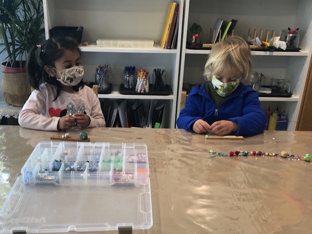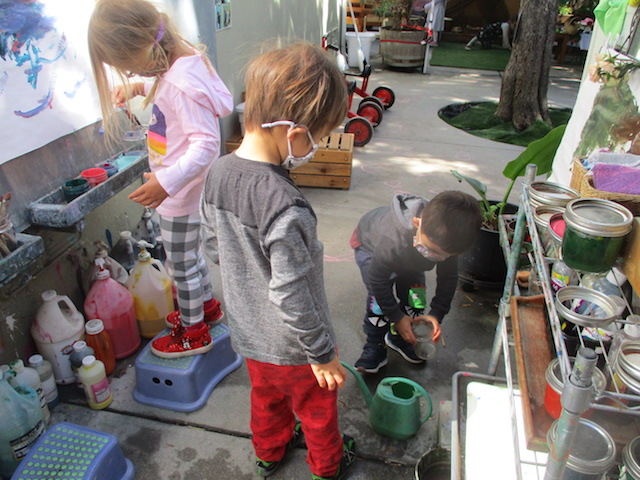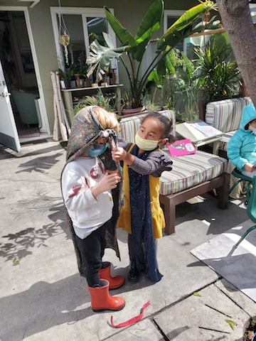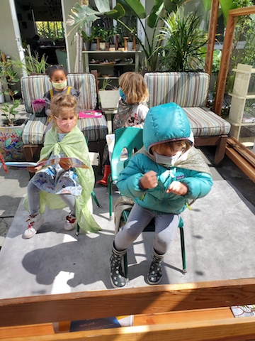 A variety of materials are introduced to offer children multiple avenues for expressive language. A language can be spoken through paint, clay, woodworking, movement, music, etc. What we have observed in the Cilantro group is their natural draw to the language of dramatic role playing. We see this interactive type of play being used as a strategy to formulate friendships, to try on a new persona, and to test powerful roles.